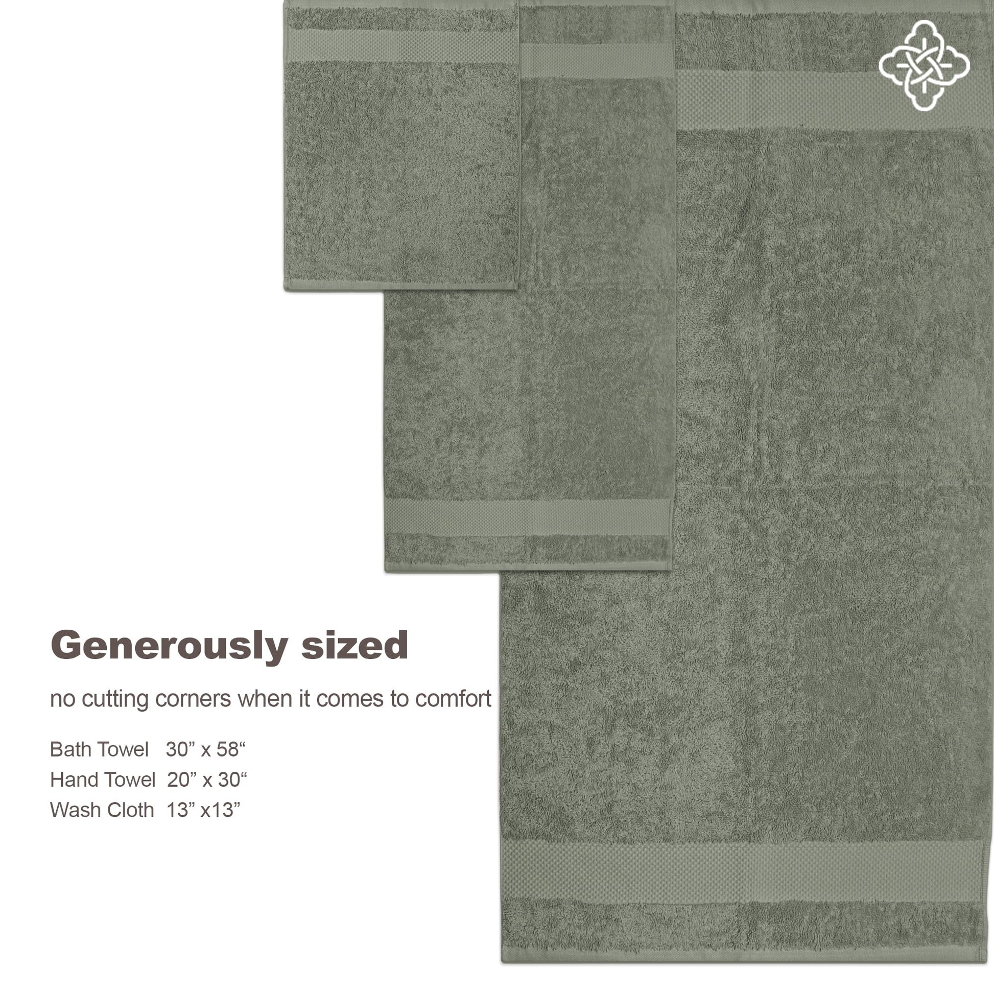 - GENEROUSLY SIZED BATHROOM TOWEL SET - No cutting corners. All towels are generously large sized for your comfort. Bath Towel - 30 x 58 inches, Hand Towel - 20 x 30 inches, Washcloths - 13 x 13 inches.