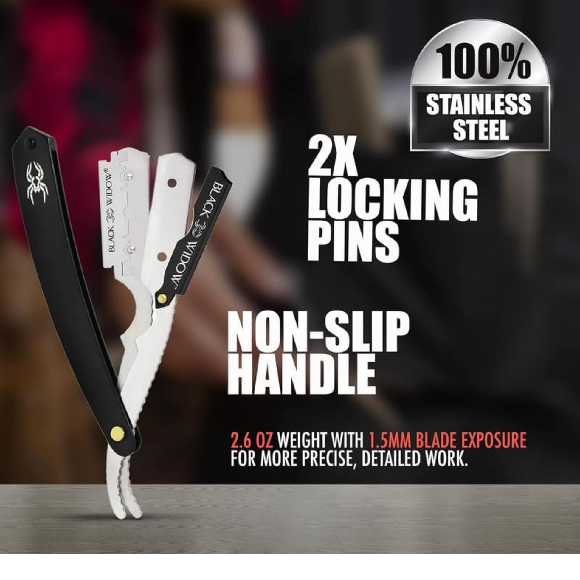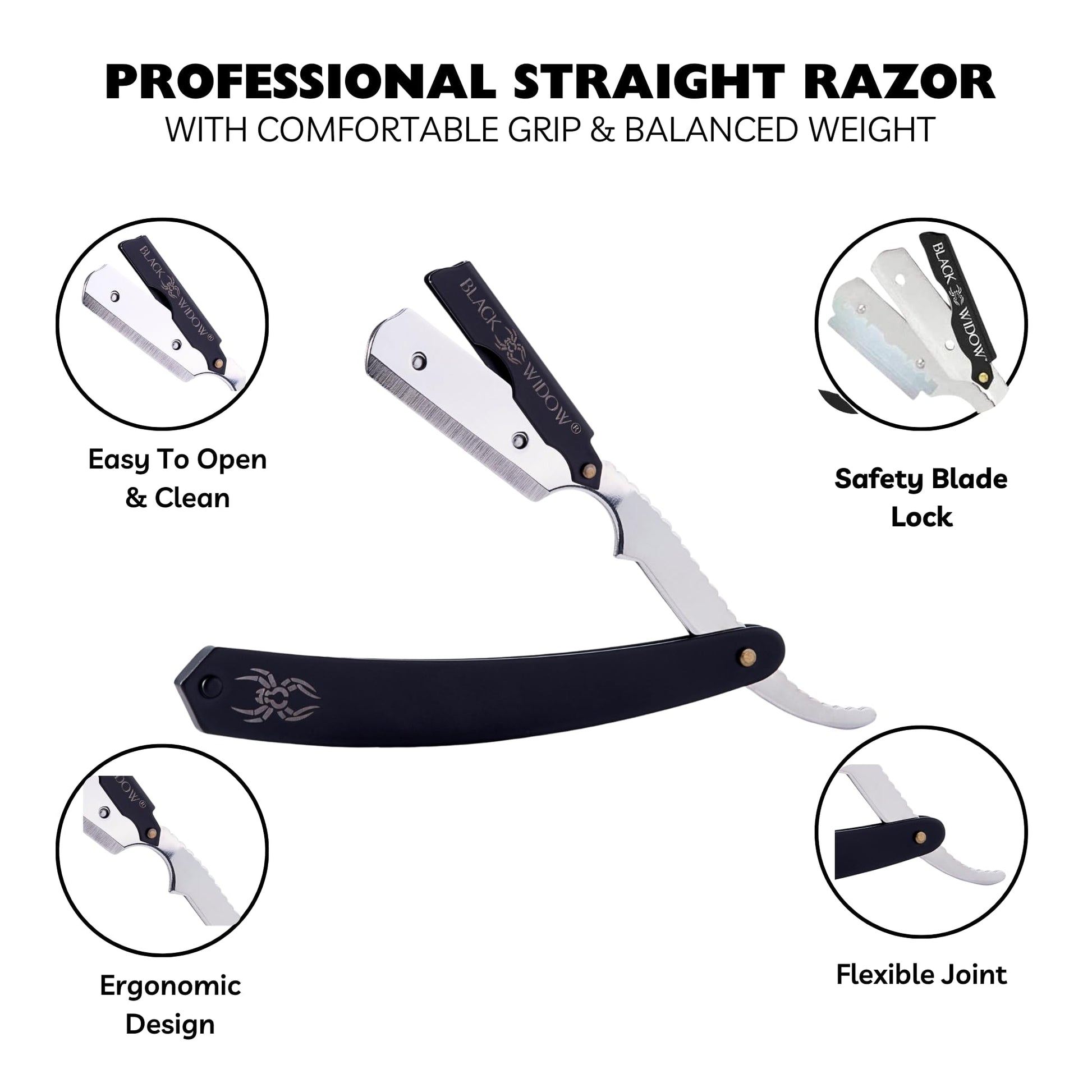 Black Widow Professional Barber Straight Edge Razor – Stainless Steel Shavette, 1.5 mm Blade Exposure, Matte Black & chrome, 10 Double Edge Blades (20 Single-Edge) for Lineups & Beard Shaping