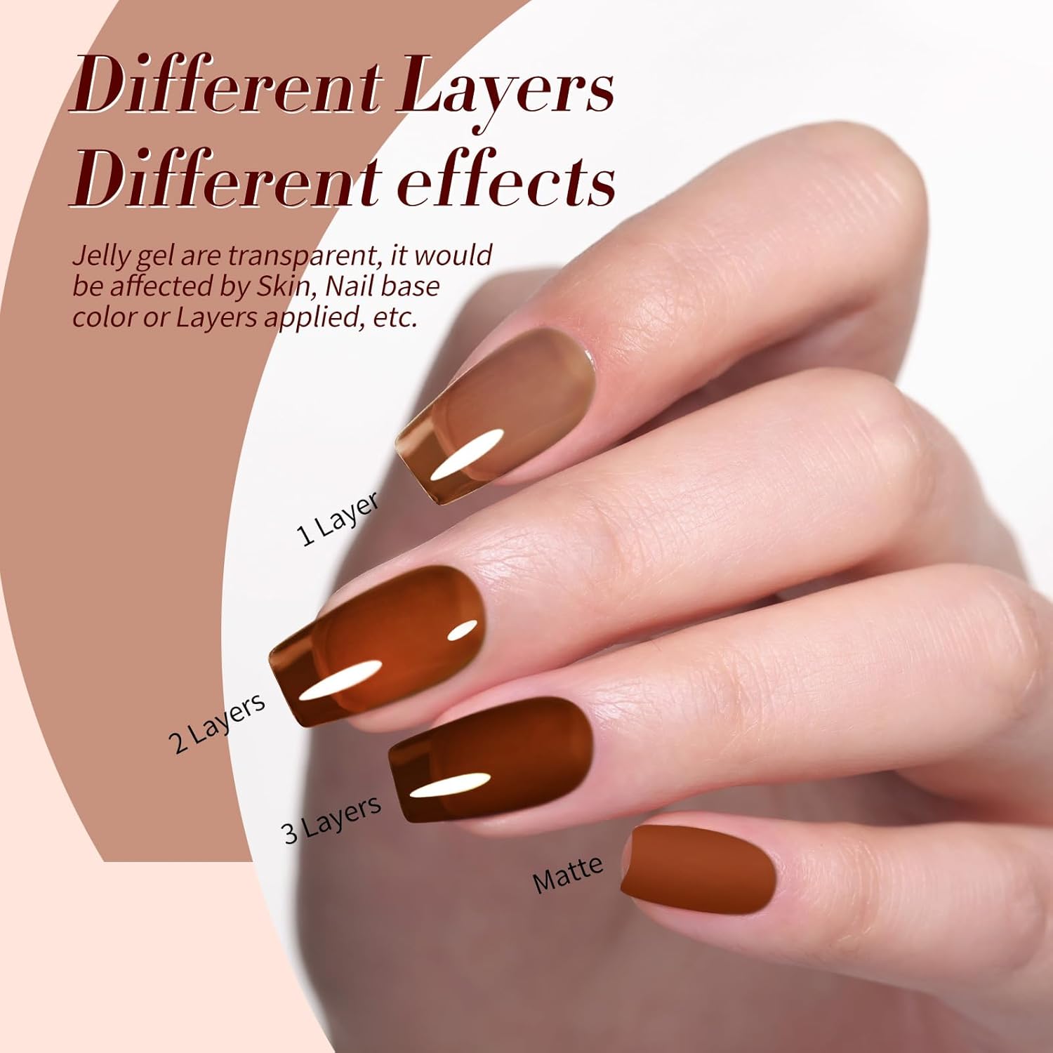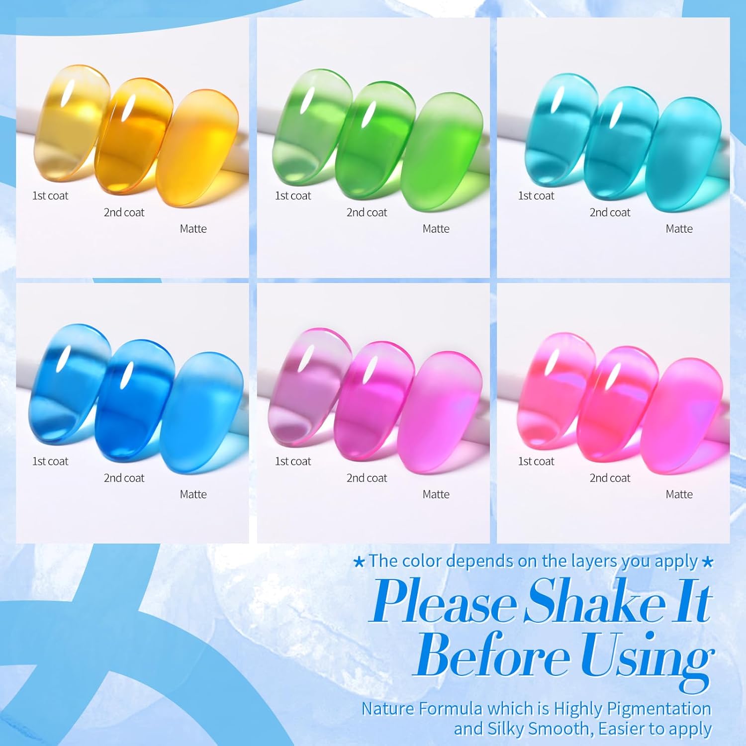 - PACKAGE CONTENTS: 6 Bottles neon jelly gel nail polish.Include Red Blue Green Purple Brown Yellow Colors.A set of gel polish allows you to try multiple different effects.You can DIY various nail art styles.Use as regular color gel,blooming gel effect,gradient effect.