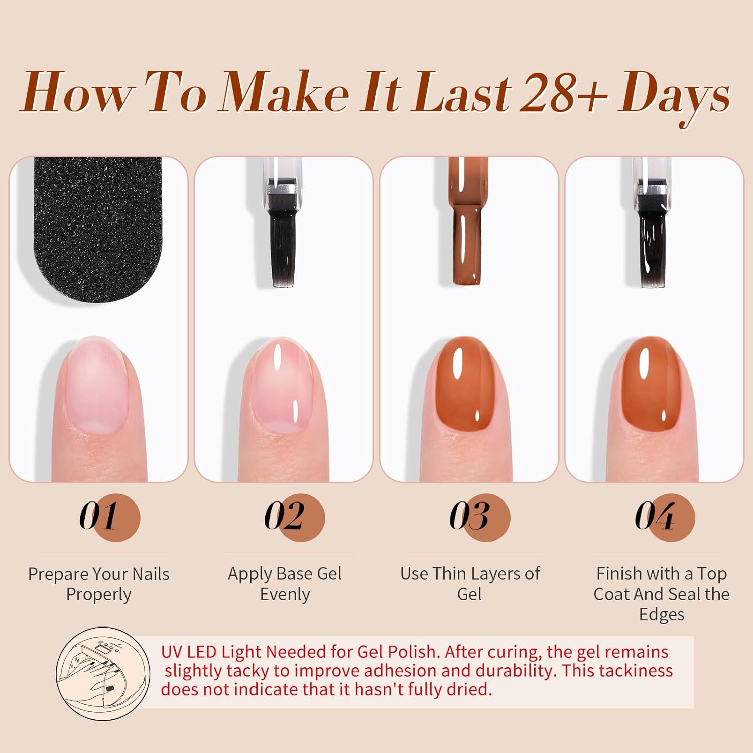 - EASY APPLICATION AND HEALTHY GEL POLISH: Healthy ingredient with low odor! No harsh ingredients or adhesives that lead to damaged nails, under the correct use steps, it can last for 21-28 days and keep the shiny luster. You'll never have to worry about your nails peeling off while showering and doing housework.