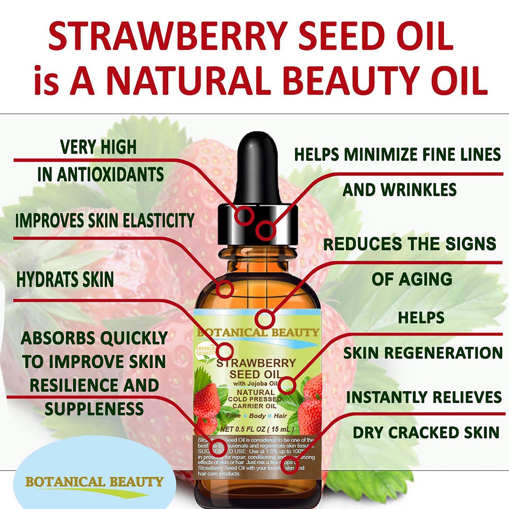 - Botanical Beauty STRAWBERRY SEED OIL is rich in omega 3 and Linolenic Acid, high in Vitamin A, Vitamin B complex, Vitamin C and Vitamin E. Due to its rapid absorption and excellent emollience, it is especially well suited for use in facial, lip, body, hair care and massage products.