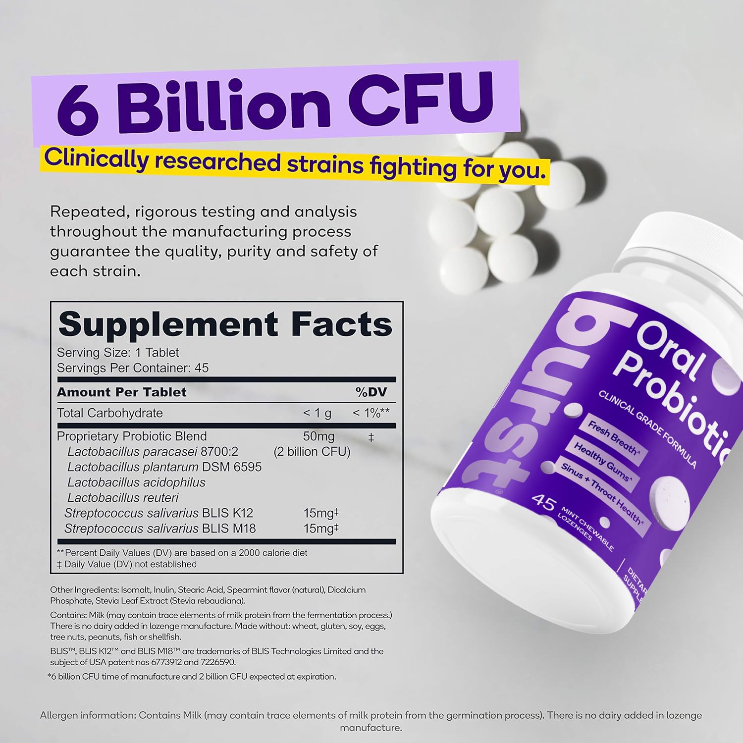 Burst Dental Probiotics (45 Count) | Healthy Oral Cavity, Bad Breath, Immune System & Sinus Support | Promotes Upper Respiratory Health and Beneficial Bacteria | Blis K12 & M18 | Packaging May Vary