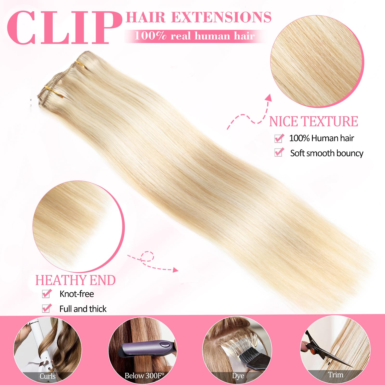 Clip in Hair Extensions Real Human Hair, Seamless Balayage Human hair Clip ins Extensions for Women Invisible Straight 8Pcs Double Weft Dark Blonde Highlight Bleach Blonde 16inch 90g