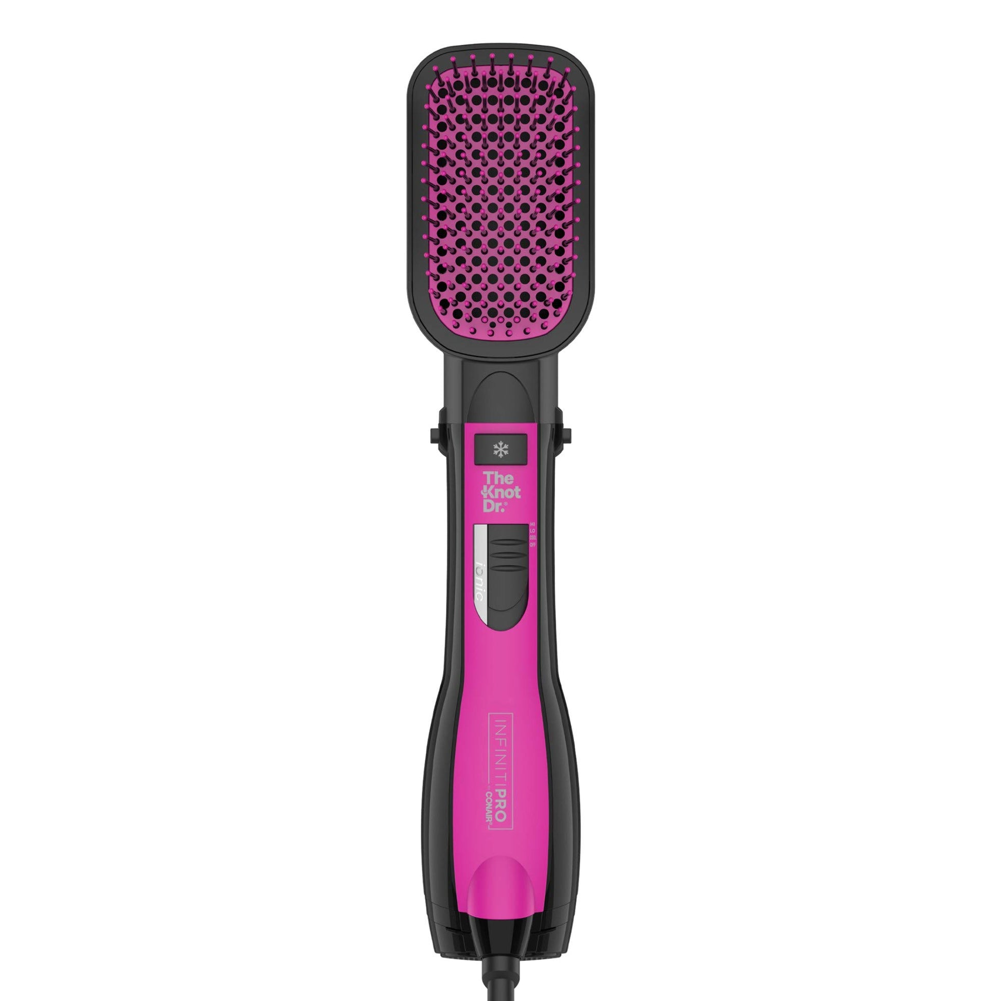 Details: Now you can detangle, dry, and style in one easy step, courtesy of the InfinitiPRO by Conair with The Knot Dr. All-in-One Smoothing Dryer Brush. Equipped with 136 Flexalite bristles spaced just the right way for painless detangling, this styling essential quickly and easily smooths away knots. The ultra-flexible, epoxy-tipped bristles glide through wet hair without snagging or pulling. Perfect for all hair types and lengths, the silicone-cushioned paddle is specially designed for smoothing and adding shine. To dry and style at the ideal temperature for your hair type, select cool, low, or high heat. Select cool shot to lock in your look. A powerful ion generator eliminates frizz, leaving hair silky smooth and frizz free. High performance and versatile, with 1000 watts of power, this lightweight, innovative smoothing brush makes salon blowouts at home easy. You can even use the handle as a dryer, without attachments, to dry damp hair before styling. Conveniently compact, this styling tool is built to simplify storage and travel.