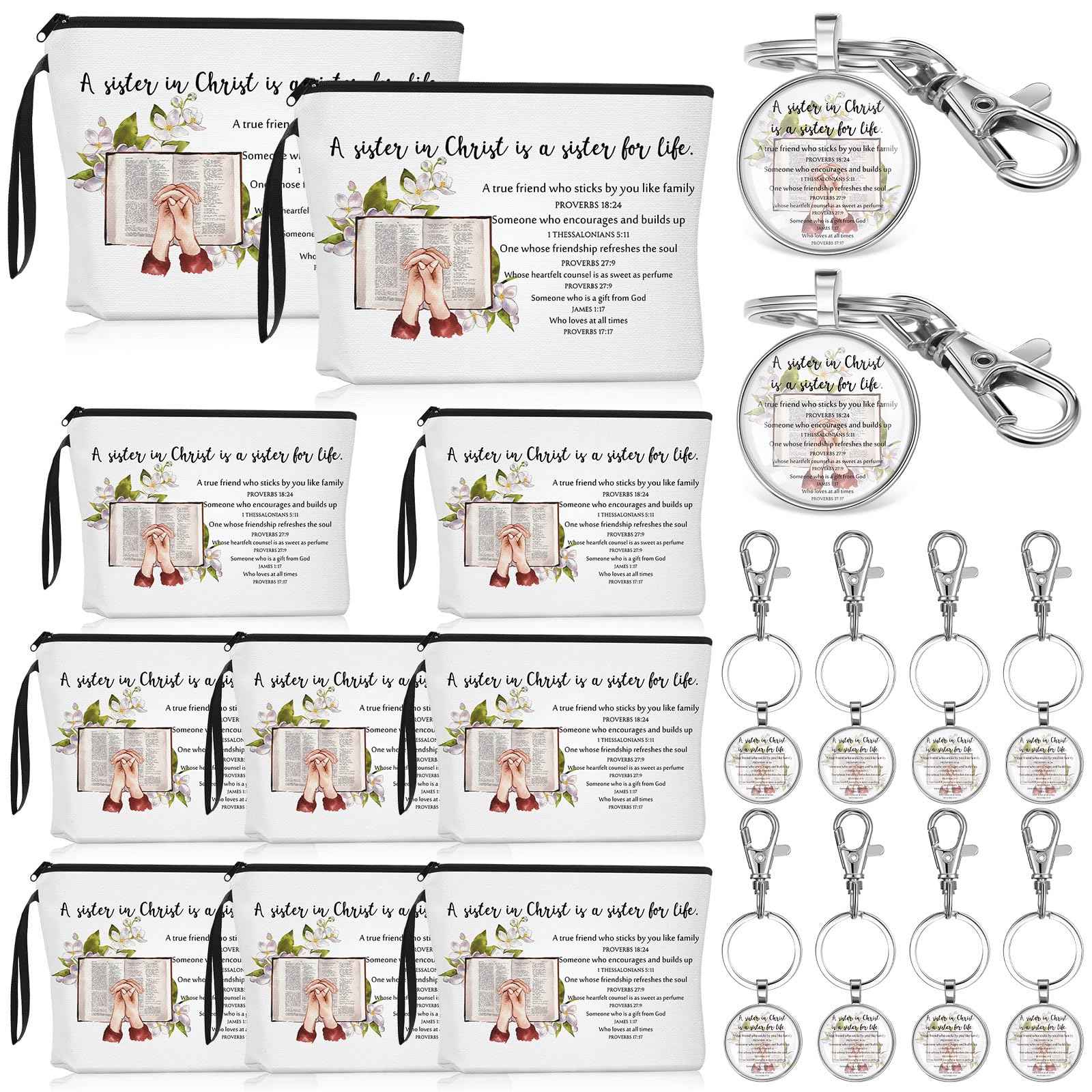 Dansydaisy 16 Pcs Christian Church Sister in Christ Makeup Bag Bible Verse Keychains for Women Birthday Friendship Gift
