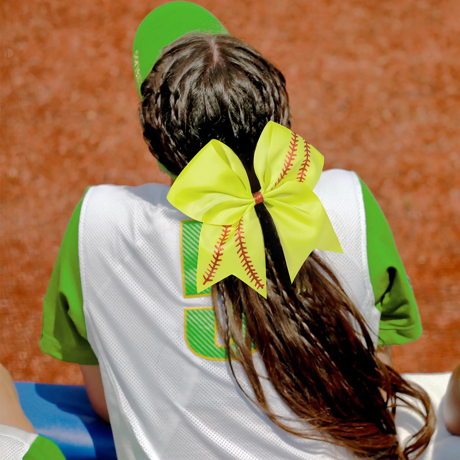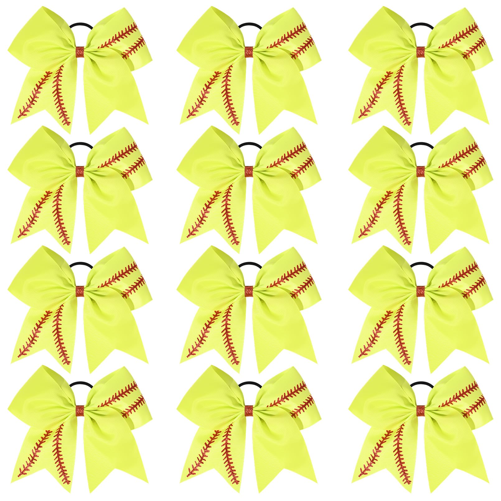 DEEKA 12 PCS Softball Cheer Bows with 2 Glitter Stitching Cheerleader Team Bows Elastic Band for Softball Sports Girls (Neon Yellow+Red Stitching)