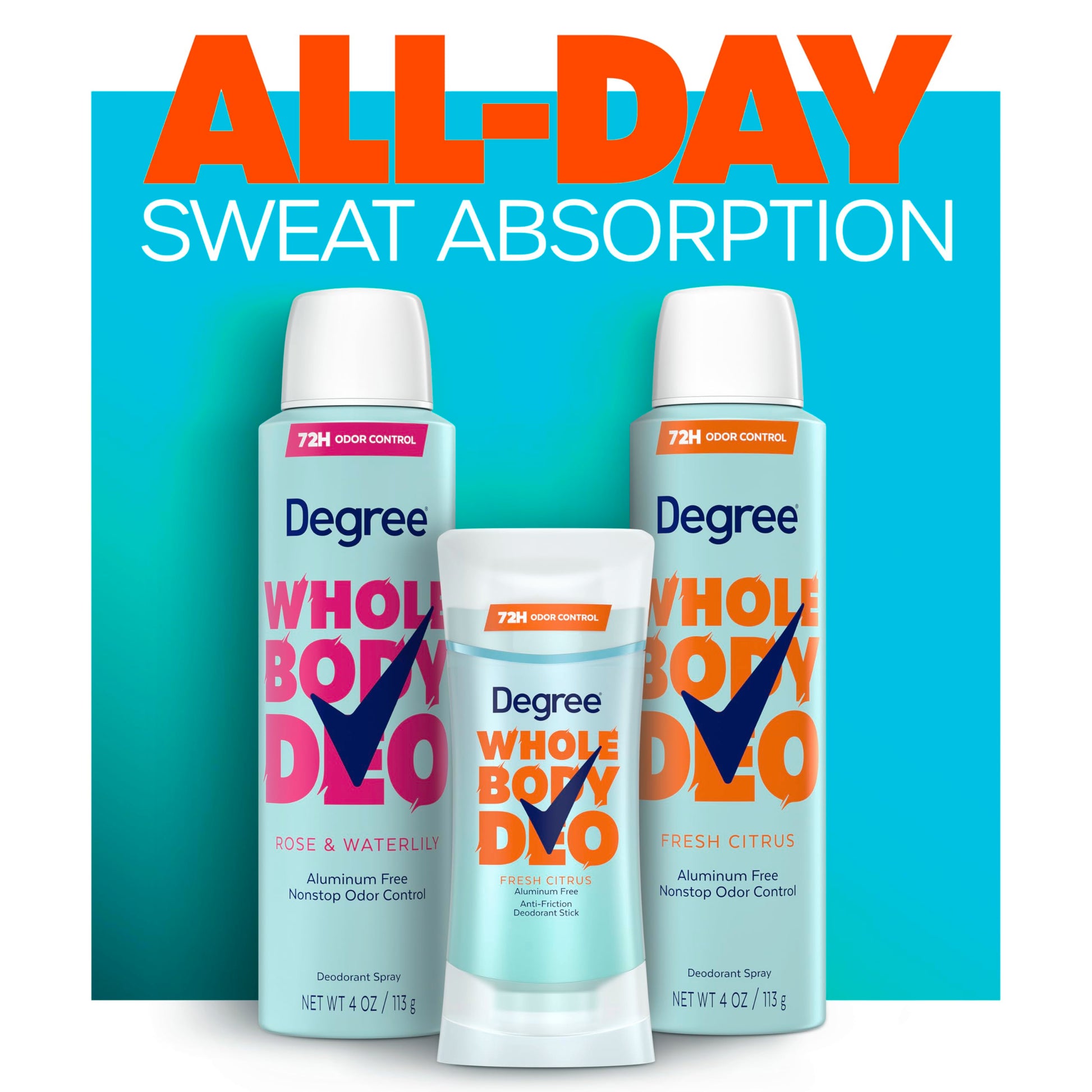 - KEEP FRESH: Affordable and effective, Degree Women’s Whole Body Deodorant Spray provides up to 72hrs of odor protection.