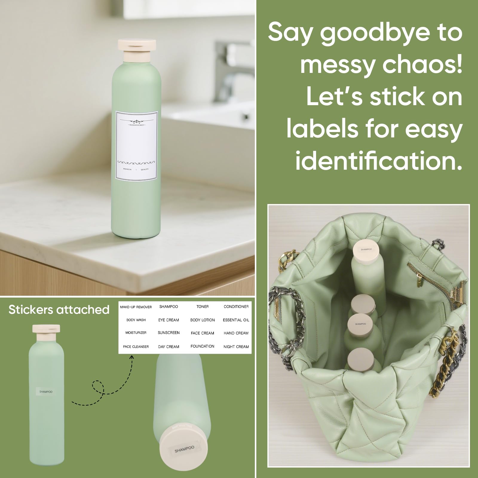 - User Friendly Features for Easy Use: The convenient flip cap allows for easy dispensing, and the shampoo bottles are designed to be easy to handle, even in the shower or bathroom. Included 2 different waterproof label stickers let you easily identify contents, while the bottles’ sturdy build ensures they aren’t flimsy and can withstand daily use