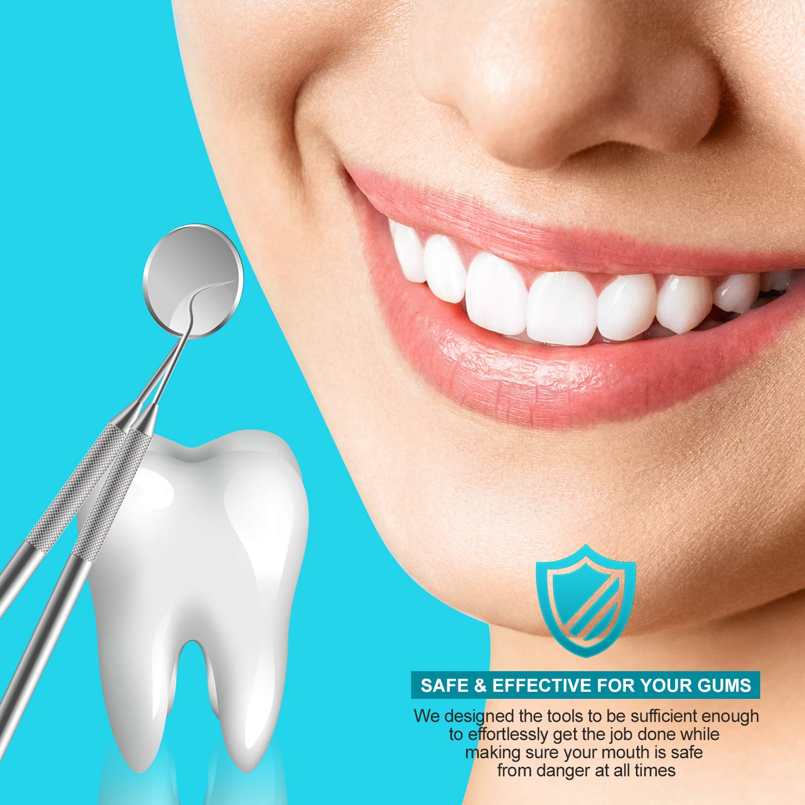 - ✔ 6-PIECE DENTAL TOOL SET: Includes mouth mirror, tweezer, probe, hoe tartar scraper, sickle scraper, and stain remover—professional quality.