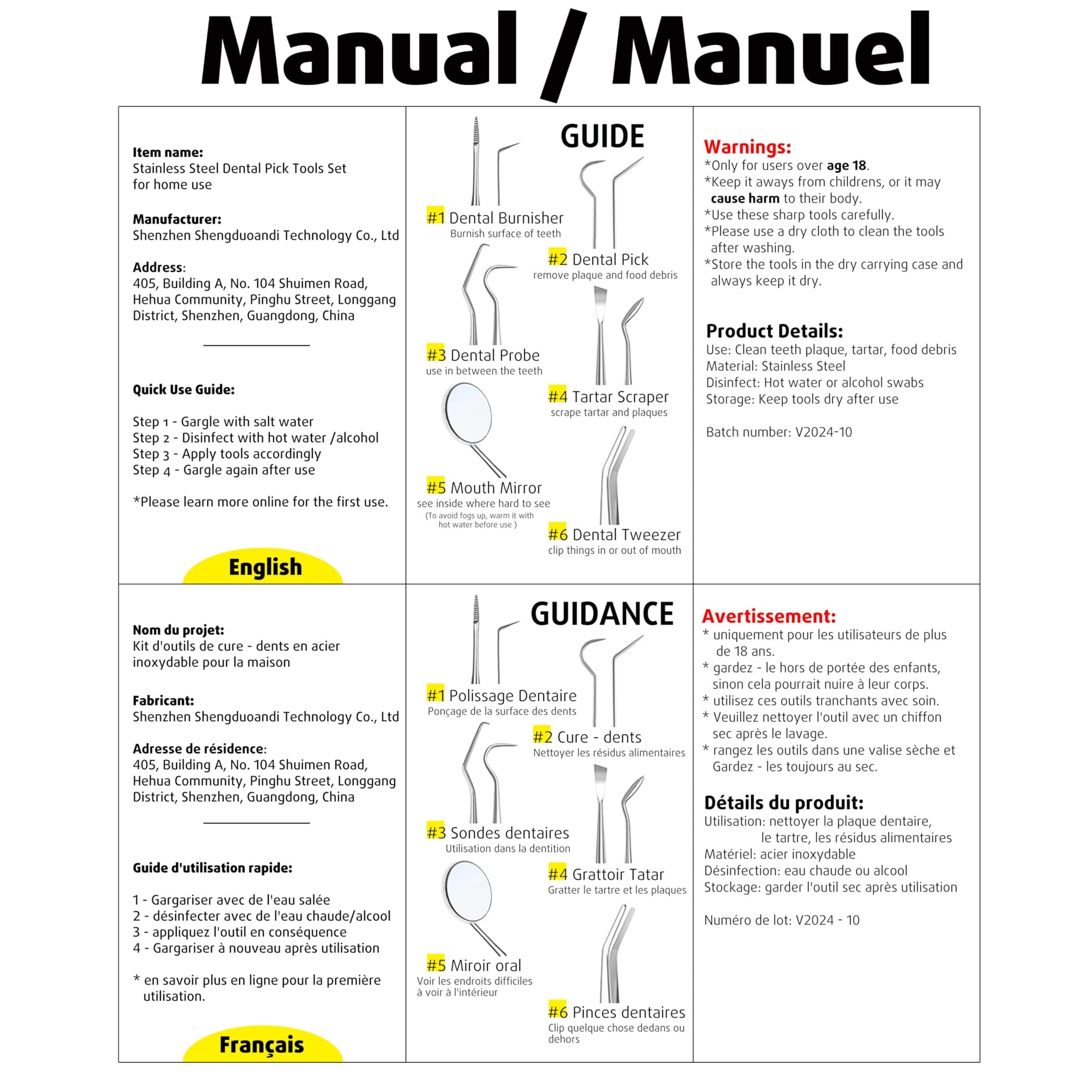 - Versatile 6-Piece Dental Hygiene Kit: Contains all essentials: dental mirror, tartar scraper, gum cleaner, probe, tweezer, and picks. Easy-to-follow instructions included. Ideal for families, travelers, and pet owners seeking gentle, effective oral care