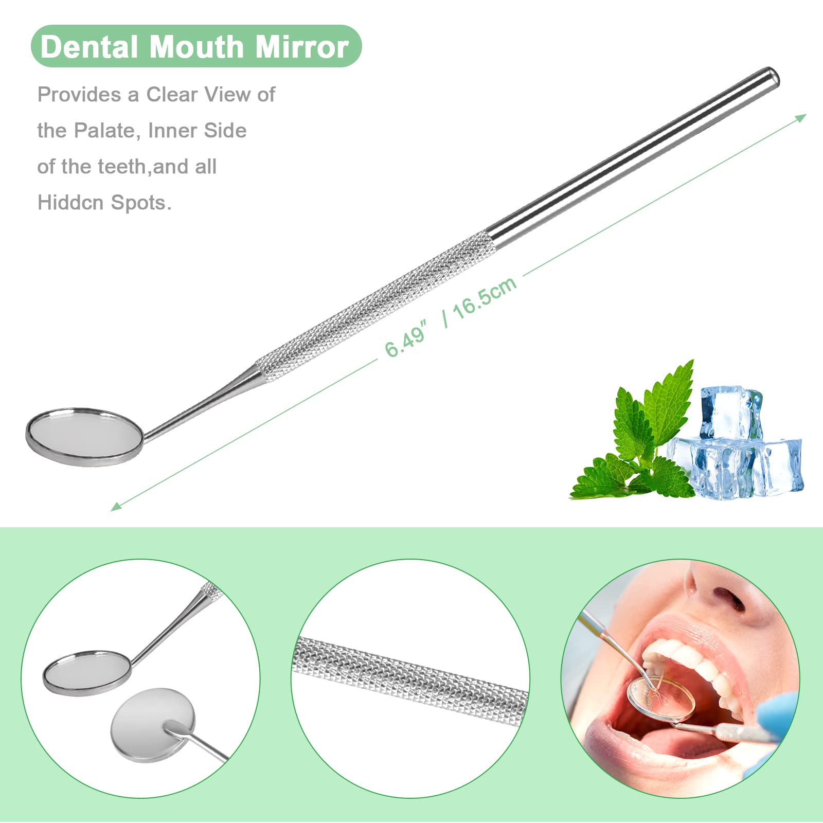 - ✔ HIGH QUALITY MATERIAL: Our Professional dental Tools are made of 100% surgical grade stainless steel which is durable and completely safe. This high material keeps the products from being rust even after many years of use. In addition, Mirror encased in rugged corrosion resistant brushed stainless steel.