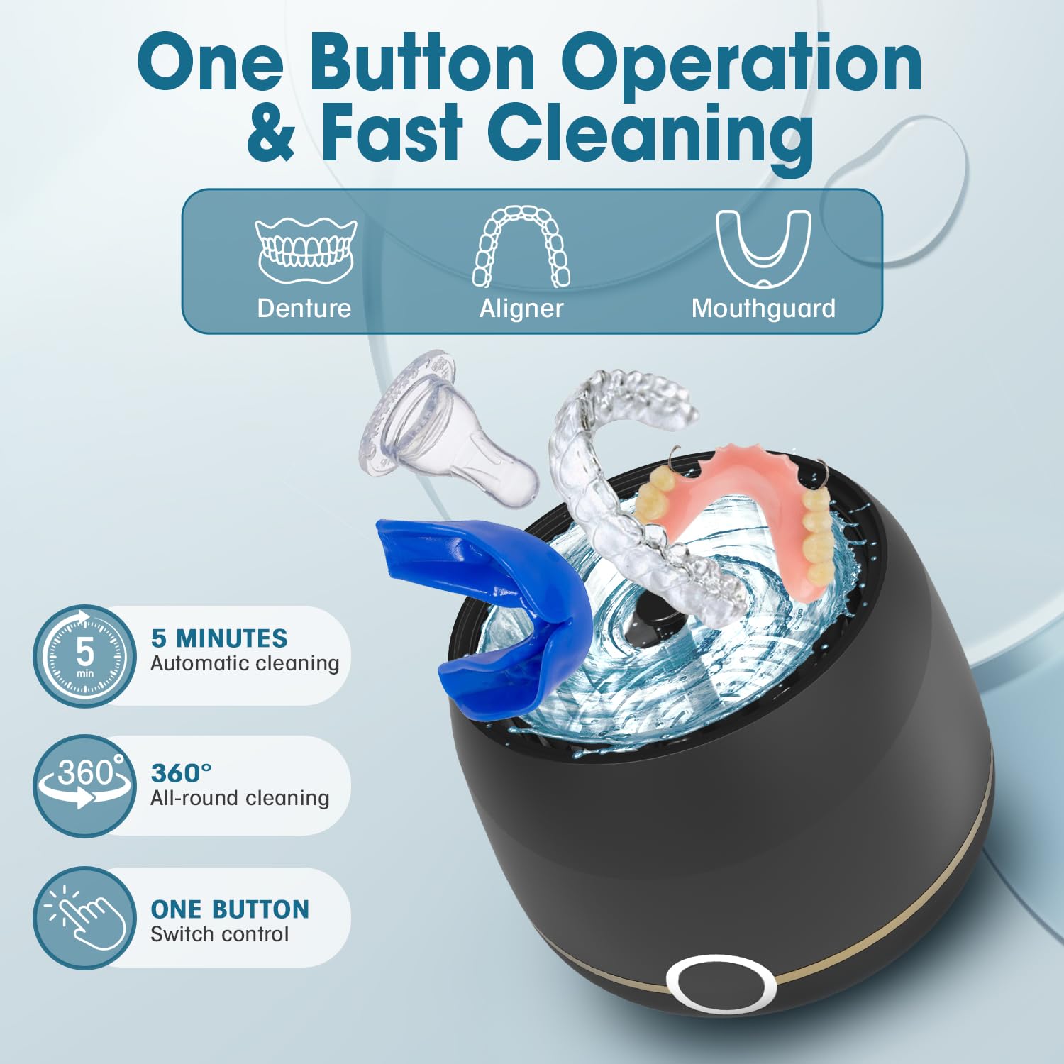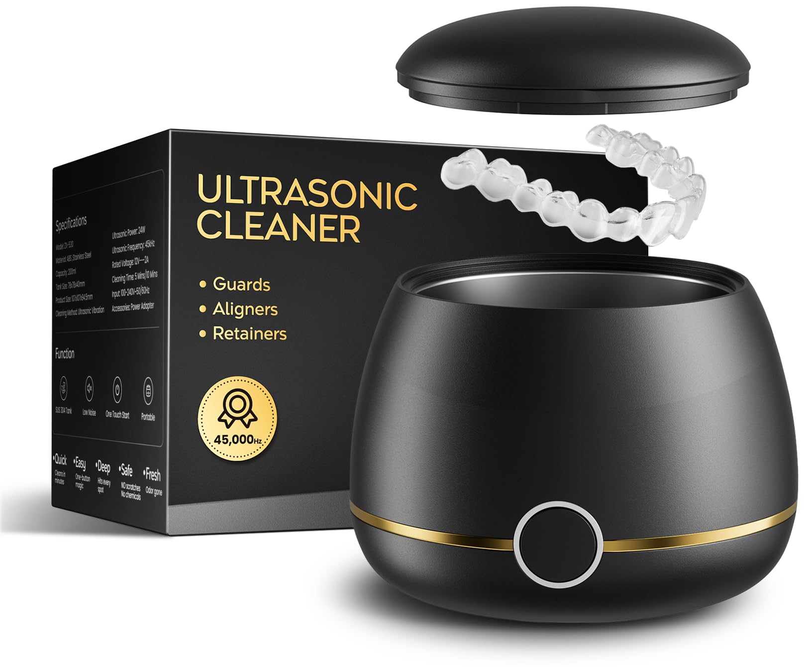 - Deep Cleaning for Retainers, Aligners & More: Say goodbye to stubborn stains and buildup on your dental appliances! Our Hypersonic Portable Retainer Cleaner uses 45 kHz ultrasonic waves to deliver a super-fast, deep clean for retainers, clear aligners, dentures, mouthguards. Unlike many ordinary night guard cleaner that take forever or require harsh chemicals, our mouth guard cleaner offers a single-step, gentle yet powerful cleaning process that gets the job done in a fraction of the time. Get your appliances looking brand new with zero hassle—effortless cleaning has never been so easy!