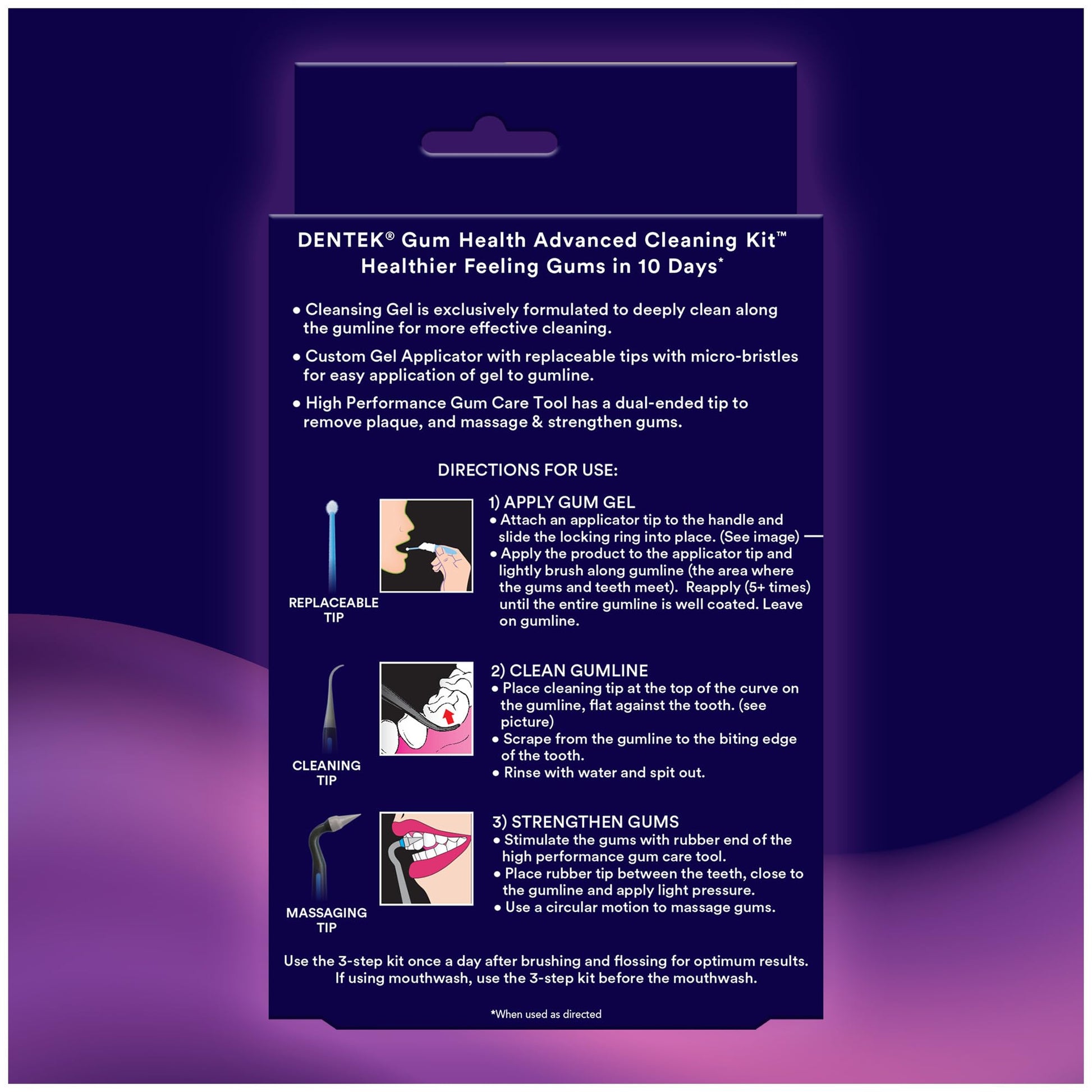 - DenTek Gum Health Advanced Cleaning Kit includes 3 dental tools for improved oral care and gum health: exclusively formulated cleansing gel, applicator with 30 disposable micro-bristle precision applicator tips, and a double-sided cleaning tool with a plaque scaler and a gum massaging tip