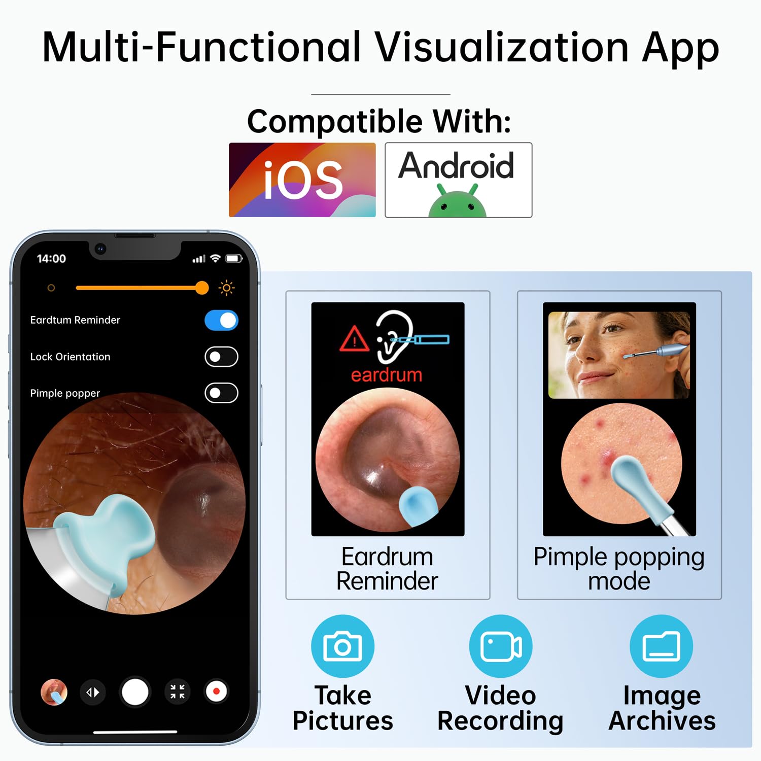 - Upgrade Smart App: The ear wax removal connects seamlessly via Wi-Fi, compatible with both iOS and Android devices; Download the App to take photos, record videos, and easily share your experiences with your loved ones