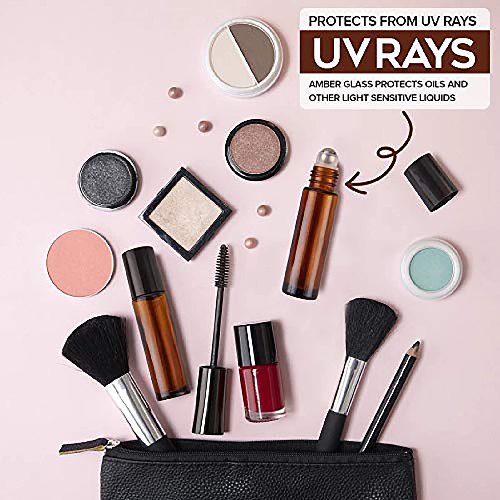 - Healthy Choice: Each roller bottle is 10ml capacity. The glass roller bottle is made of great corrosion-resistant amber glass. Durable and impact resistant. These essential oil bottles are used to hold cosmetic eye cream or lipstick, which allows you to apply evenly to prevent liquid leakage and has a massage effect