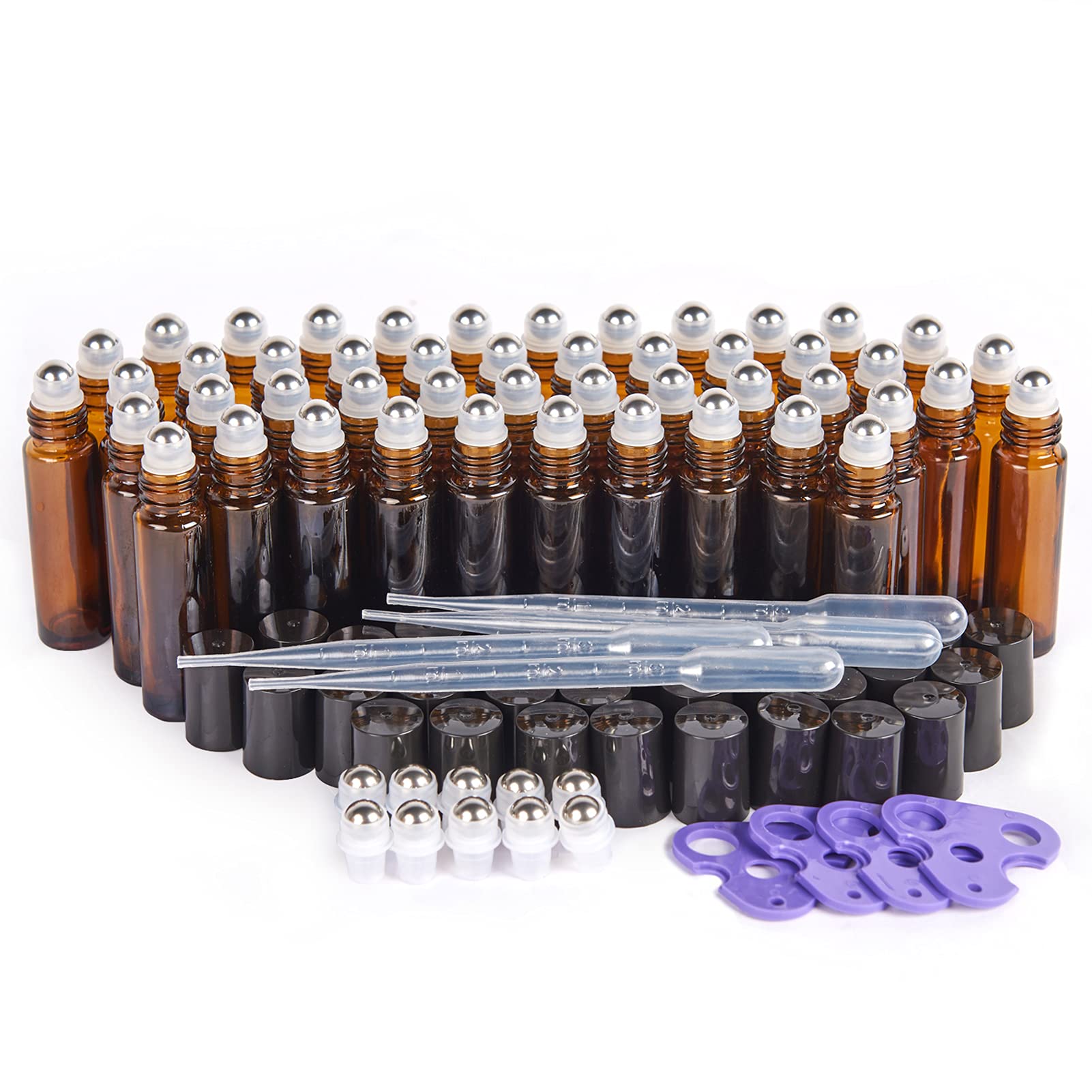 Essential Oil Roller Bottles, 48 Pack Hoa Kinh 10ml Empty Glass Amber Roller Bottles UV Protection with Stainless Steel Balls (10ml-48pack)