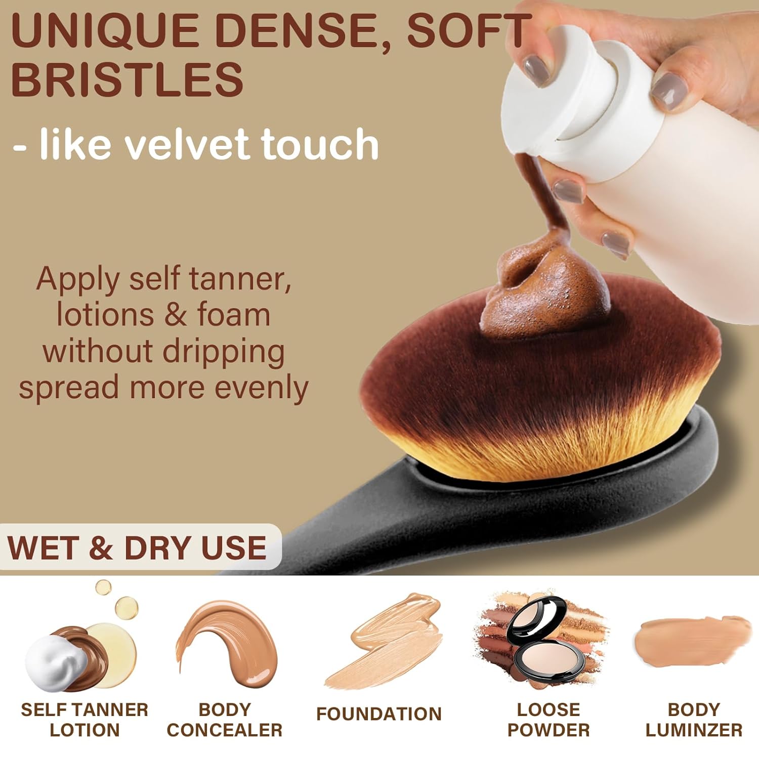 Oversized All-Purpose Makeup Brush for various body care products, such as tanning foams, oils, lotions, sunscreen, creams, self-tangers, and blending body makeup.