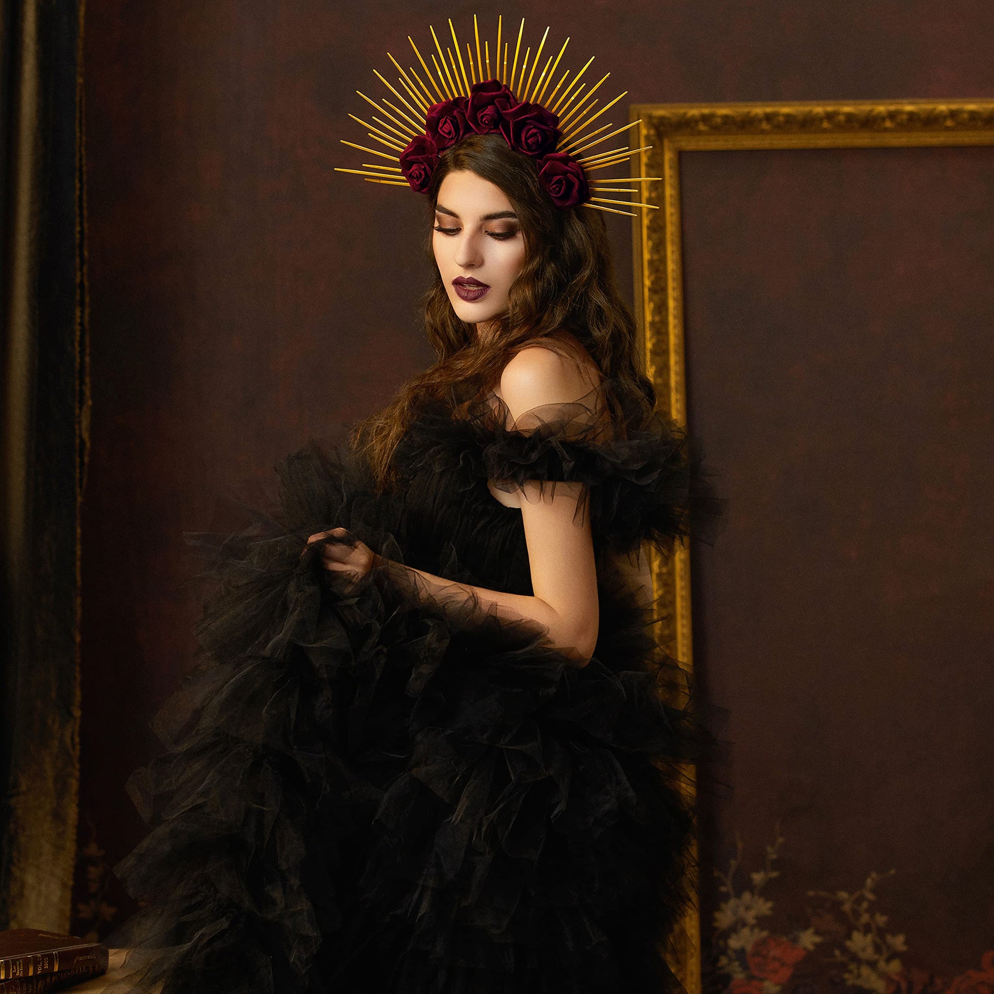 Fantherin Halo Crown with Roses Womens Mexican Flower Goddess Rose Spiked Sun Headpiece for Cosplay Halloween Costume