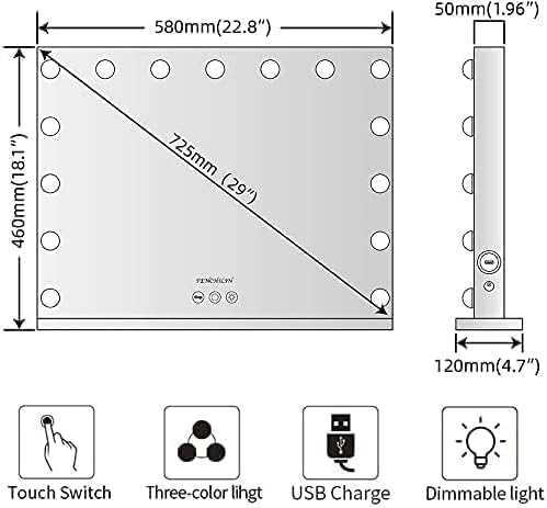 - 【Type-C & USB Charge Port】FENCHILIN vanity mirror with lights has a popular size (22.8“ x 18.1”) to view your upper body. Two charging ports USB and Type-C on the side can charge your smartphone or other devices, brings you a convenient life