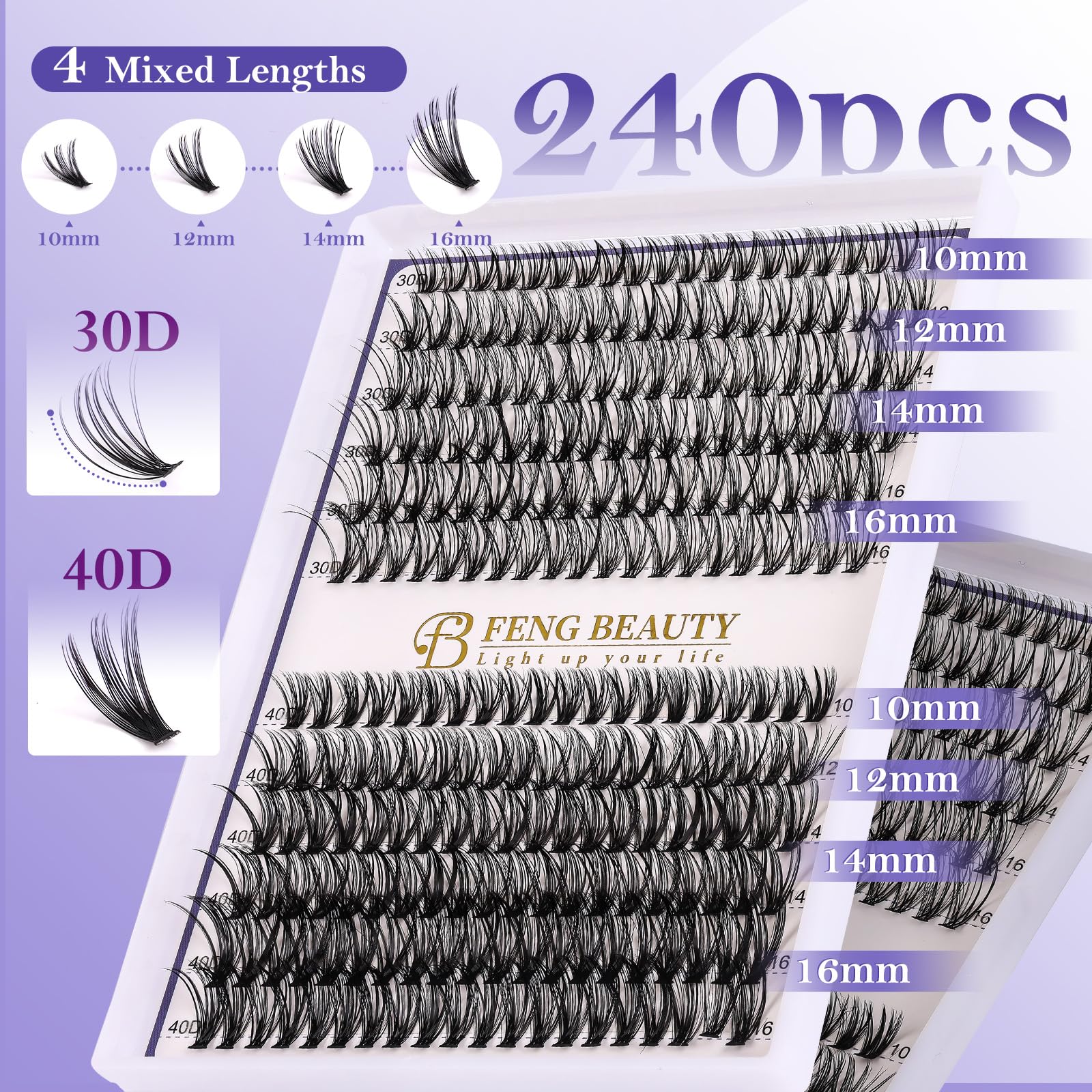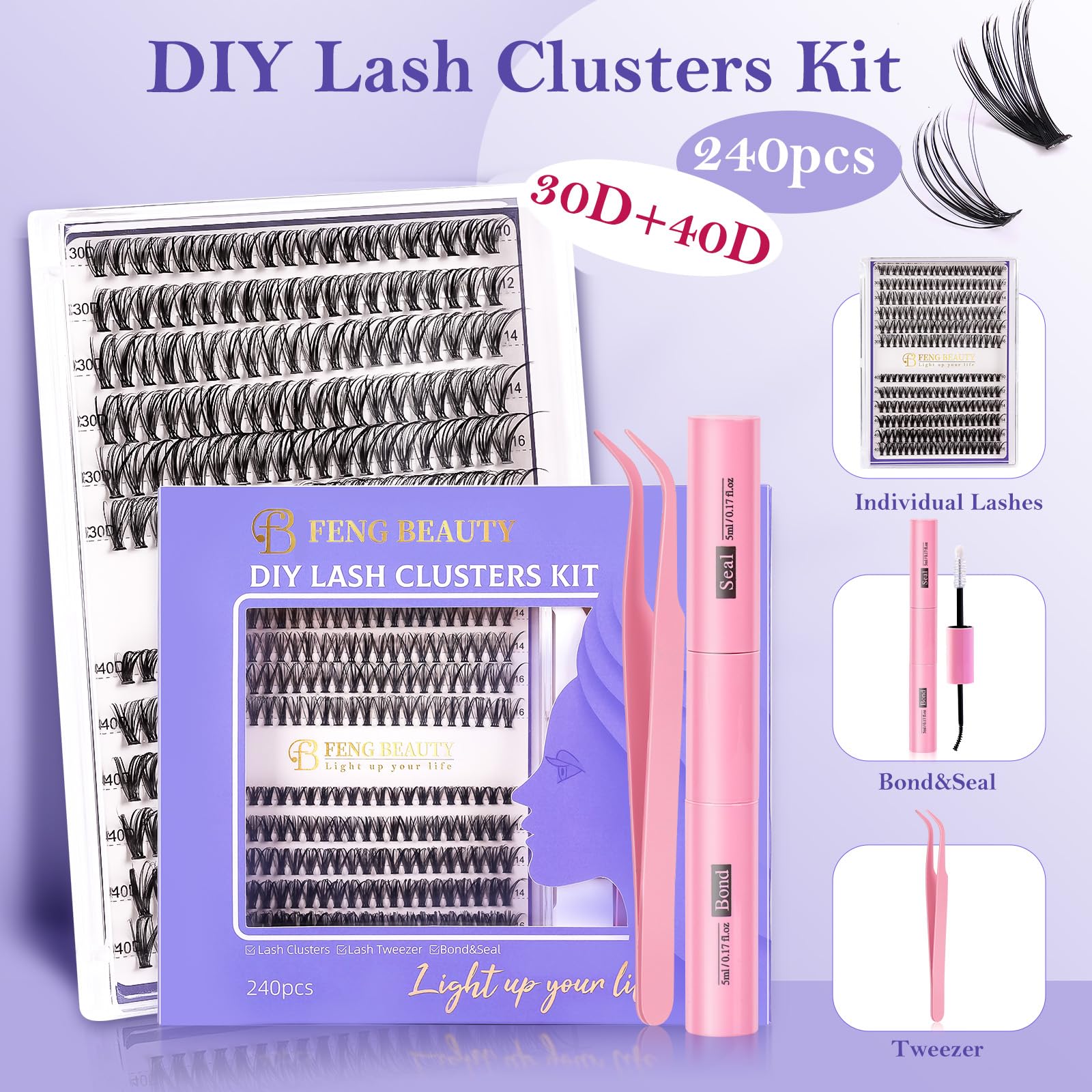 FENG BEAUTY Lash Clusters Kit – 240pcs Wispy Eyelash Clusters with Tweezer, Bond & Seal, 30D/40D, 10–16mm Fluffy Individual Lashes, Natural Look, Waterproof DIY Cluster Lash Extensions for Daily Wear