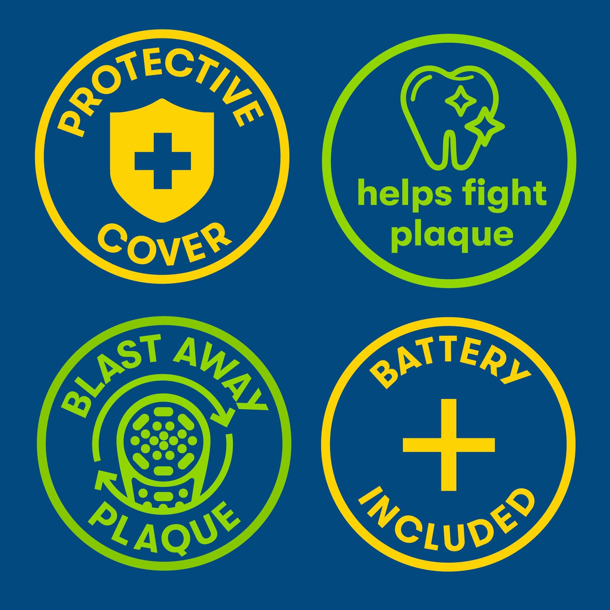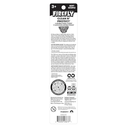 Details: Make brushing fun with Firefly's Clean N' Protect Teenage Mutant Ninja Turtles Toothbrush. The buzz of the rotary power and soft bristles helps encourage little ones to brush effectively. With stronger plaque-busting cleaning power than a manual children's toothbrush, little hands can remove plaque from their teeth. The kid-sized design makes it easier for children to clean those hard-to-reach areas of their mouth, while the massaging action of the premium soft bristles gently and effectively cleans between teeth and along the gum line. This kids toothbrush is battery-operated, so it does not require a cumbersome cord or a charger. More fun than manual brushing, kids will ask for this Firefly Clean N' Protect toothbrush featuring their favorite Teenage Mutant Ninja Turtles character by name. Any child can help defend their mouth against gum disease and tooth decay with the Firefly Clean N' Protect rotary toothbrush.