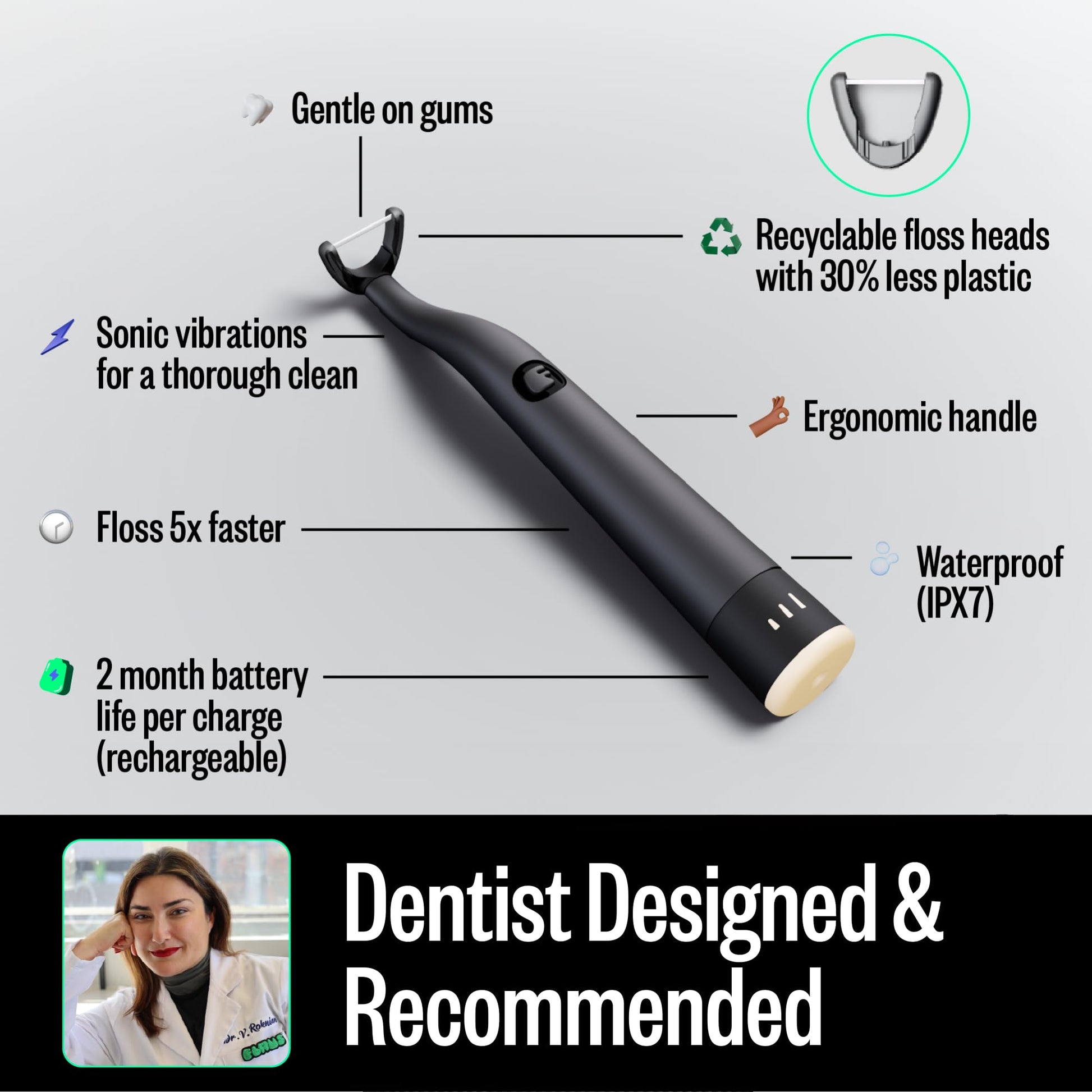 - STARTER KIT INCLUDES - 1x Electric flosser (2 month battery life with one charge), 45x gentle gliding floss head refills (toxin-free, recyclable, mint flavored), 1x Charging base, 1x USB-C charging cable
