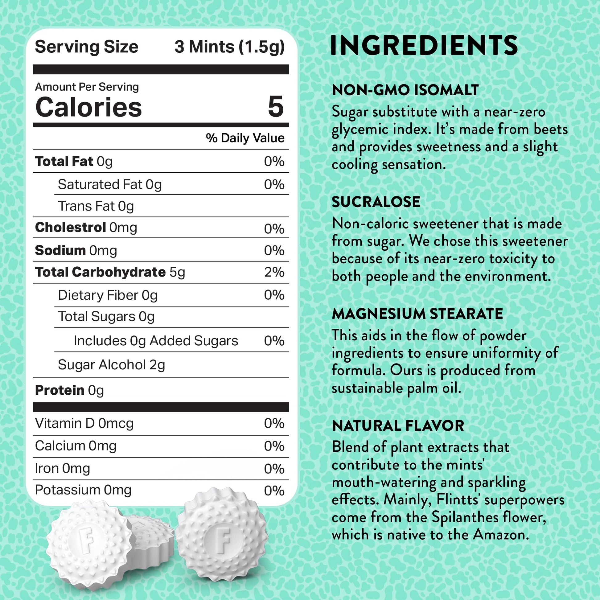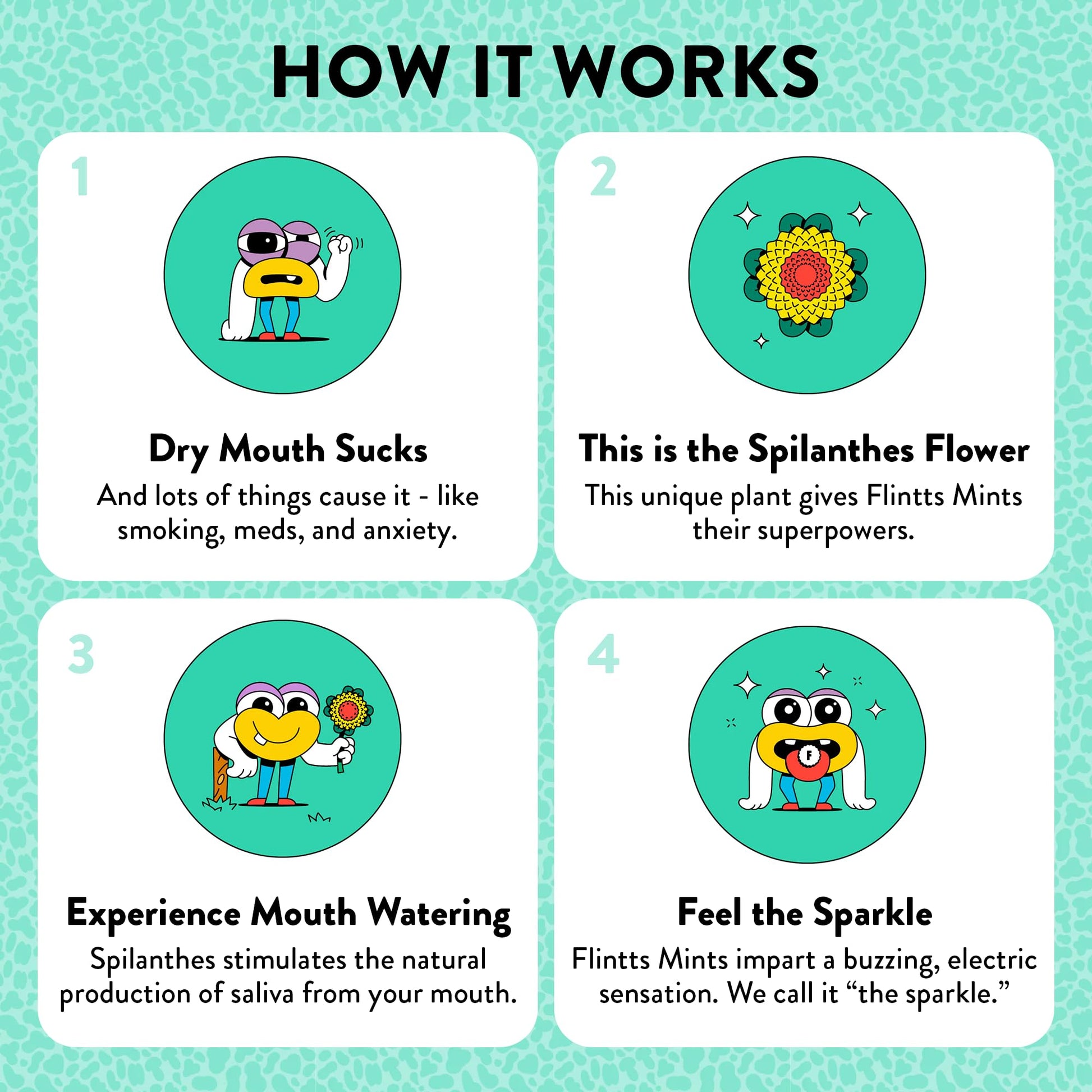 - MOUTHWATERING EFFECT - Flintts Mints make your mouth water and sparkle, which makes them perfect for combatting dry mouth after a coffee, a smoke break, or a long night out. The sparkle is a pleasant electrical sensation. Both the mouthwatering and sparkle effects come from the Spilanthes flower, which is native to Brazil and is often referred to as the Buzz Button Flower or the Electric Daisy.