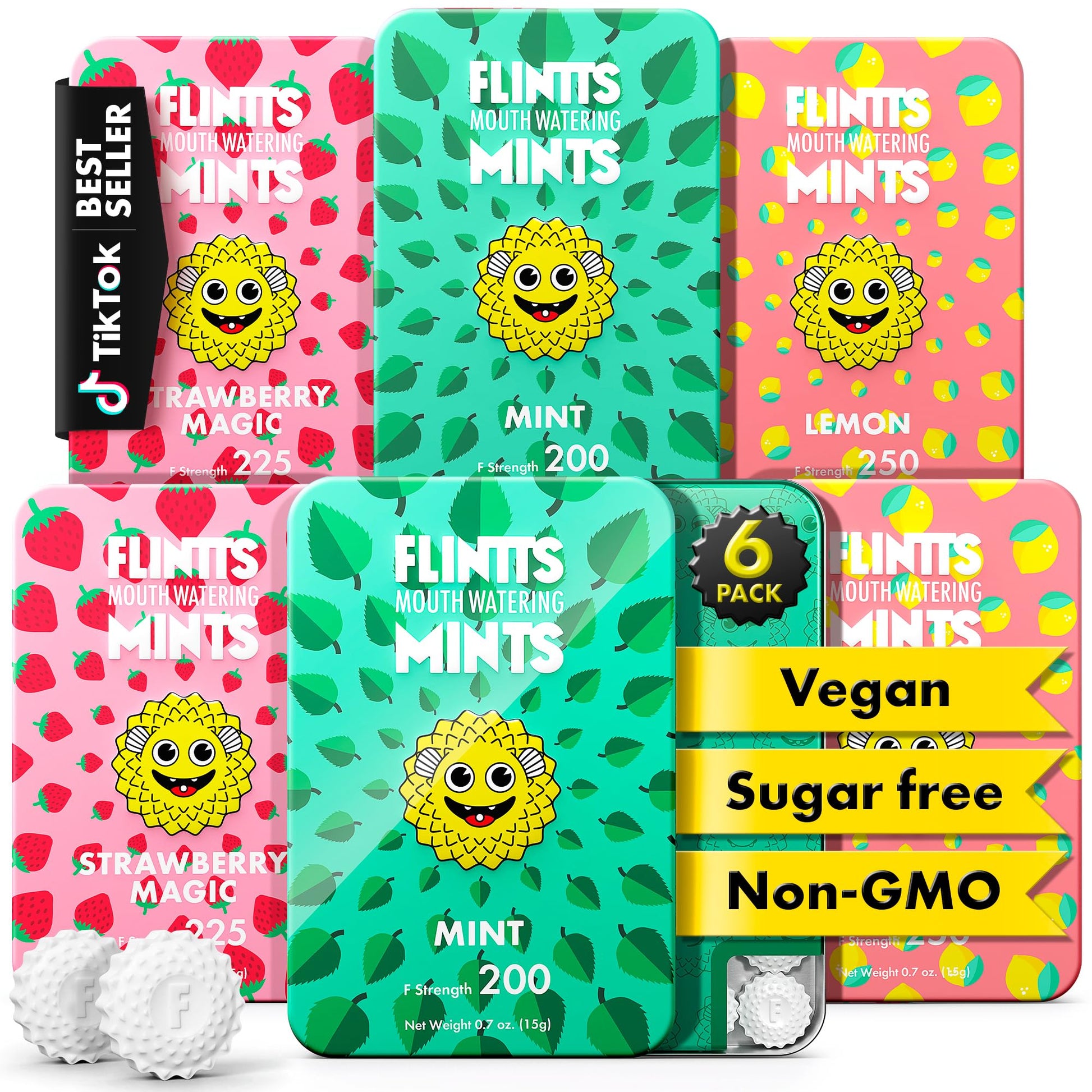 - FLAVOR PACK VARIETY - This pack of dry mouth mints includes Flintts' most popular flavors: 2x Mint, 2x Strawberry Magic, and 2x Lemon. Each offers its own distinct vibe—Mint brings a cooling, fresh breath with winter vibes; Strawberry Magic is creamy, jammy, and full of springtime energy; and Lemon delivers a juicy, sweet-and-sour burst that screams mid-summer. Together, they create a flavorful after-party in your mouth.