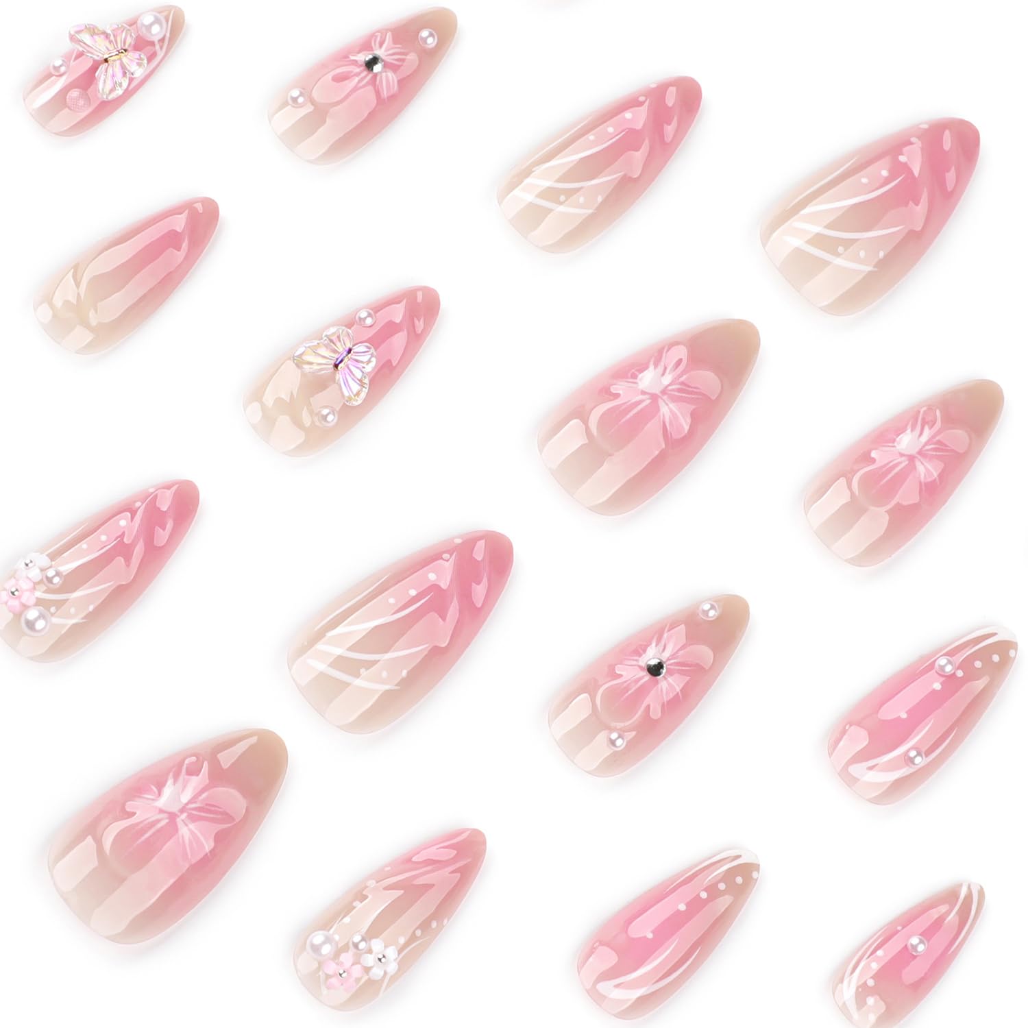 Flower Almond Press On Nails Medium Fake Nails For Spring With 3D Floral Rhinestones Design False Nail Press Ons Flossy Pink Stick On Nails Spring Summer Glue On Nails For Women Nail Supplies