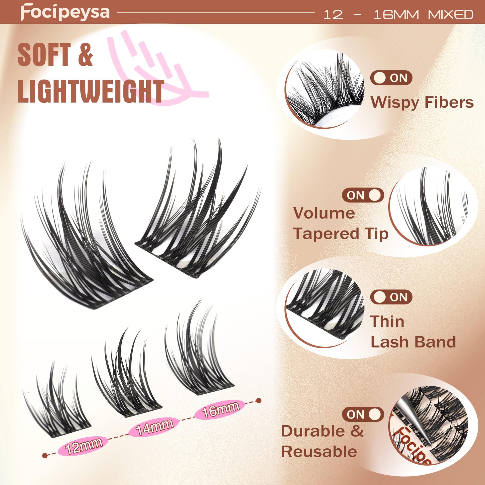 - About Focipeysa DIY lashes cluster: If you have any questions with your cluster lashes extensions, please let Focipeysa know, we are responsible for our individual eyelashes and your beauty. Thank you for choosing Focipeysa eyelash extension
