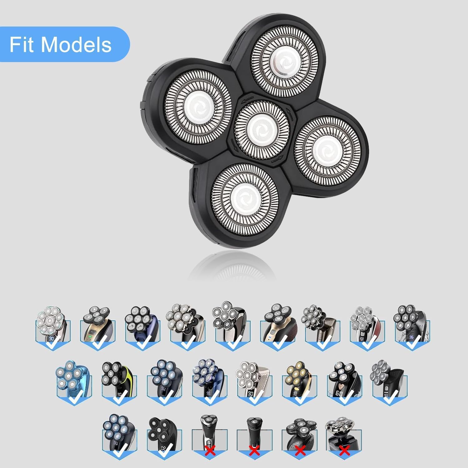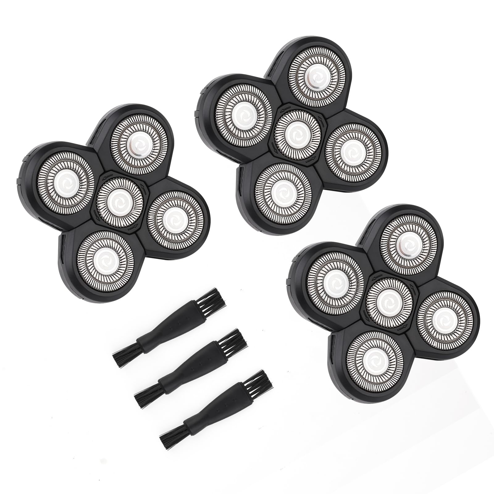 Details: 【Universal Shaving Heads】 The 5D replacement shaving head is compatible with multiple models.Interfaces can also be used. Universal 3PCS 5 Blades Shaver Replacement Heads Compatible with FREEDOM BIRD Head Shaver Replacement heads. This replacement 5D shaving head fits all 5, 6, and 7-head shavers. Make your electric shaver feel like new with this upgraded shaving head! 【Enhanced Performance】 Compared to traditional single-turn shaver heads, the shaving area is increased by 50%. The five large, flexible rotary blades conform more closely to the contours of your head and face, providing a comfortable and efficient shave.