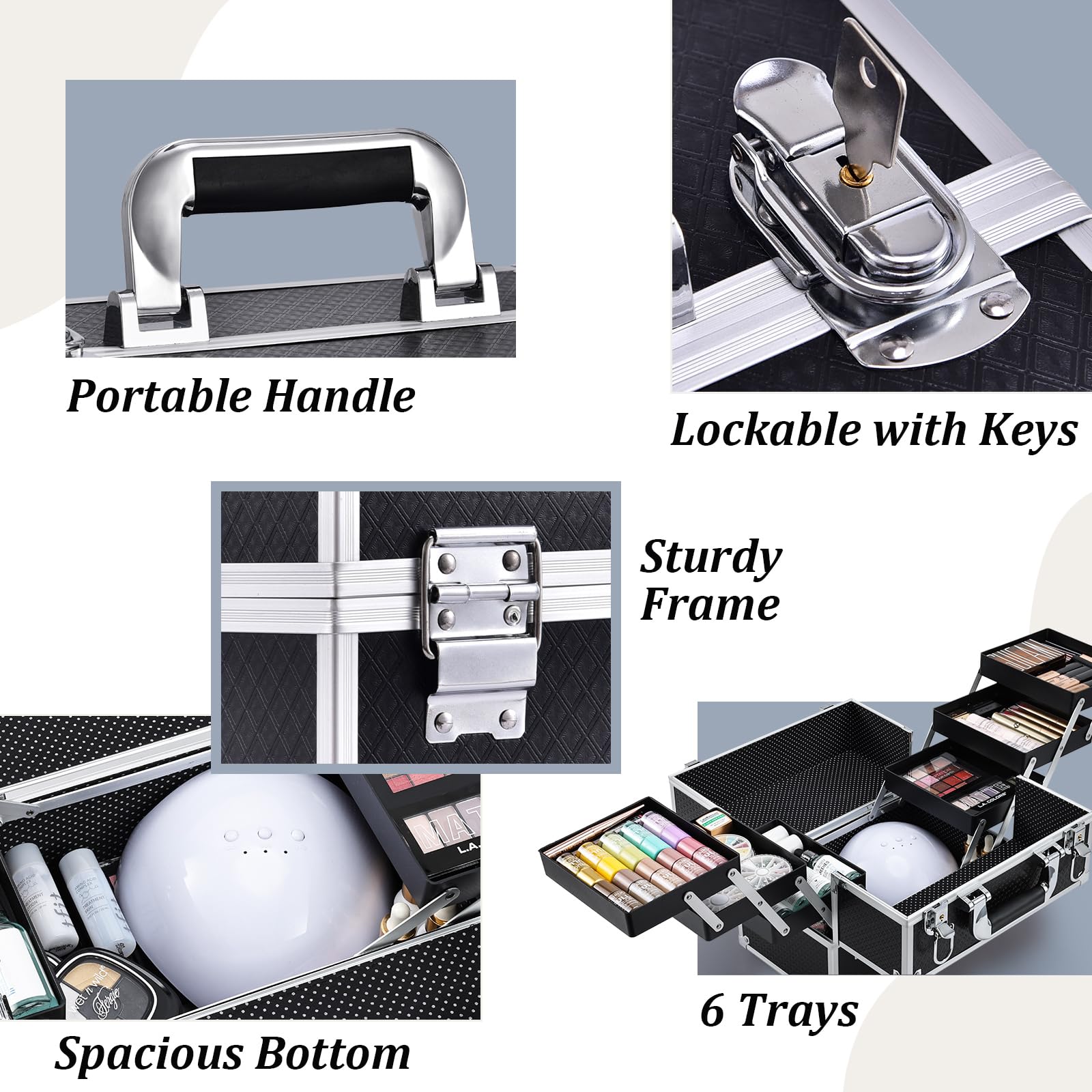 - Makeup Train Case with 6 Trays: The extendable cantilever tray with six tiers offers a spacious and practical storage solution, featuring a roomy bottom area for all your essentials. The design is enhanced by unique white spots, making it a perfect gift for women and girls who value function and style. Its flexible storage options accommodate various cosmetics, from daily toiletries to nail polishes, essential oils, jewelry, paintbrushes, and crafting tools. The large bottom space is ideal for palettes and travel-size bottles, keeping everything organized and easily accessible.