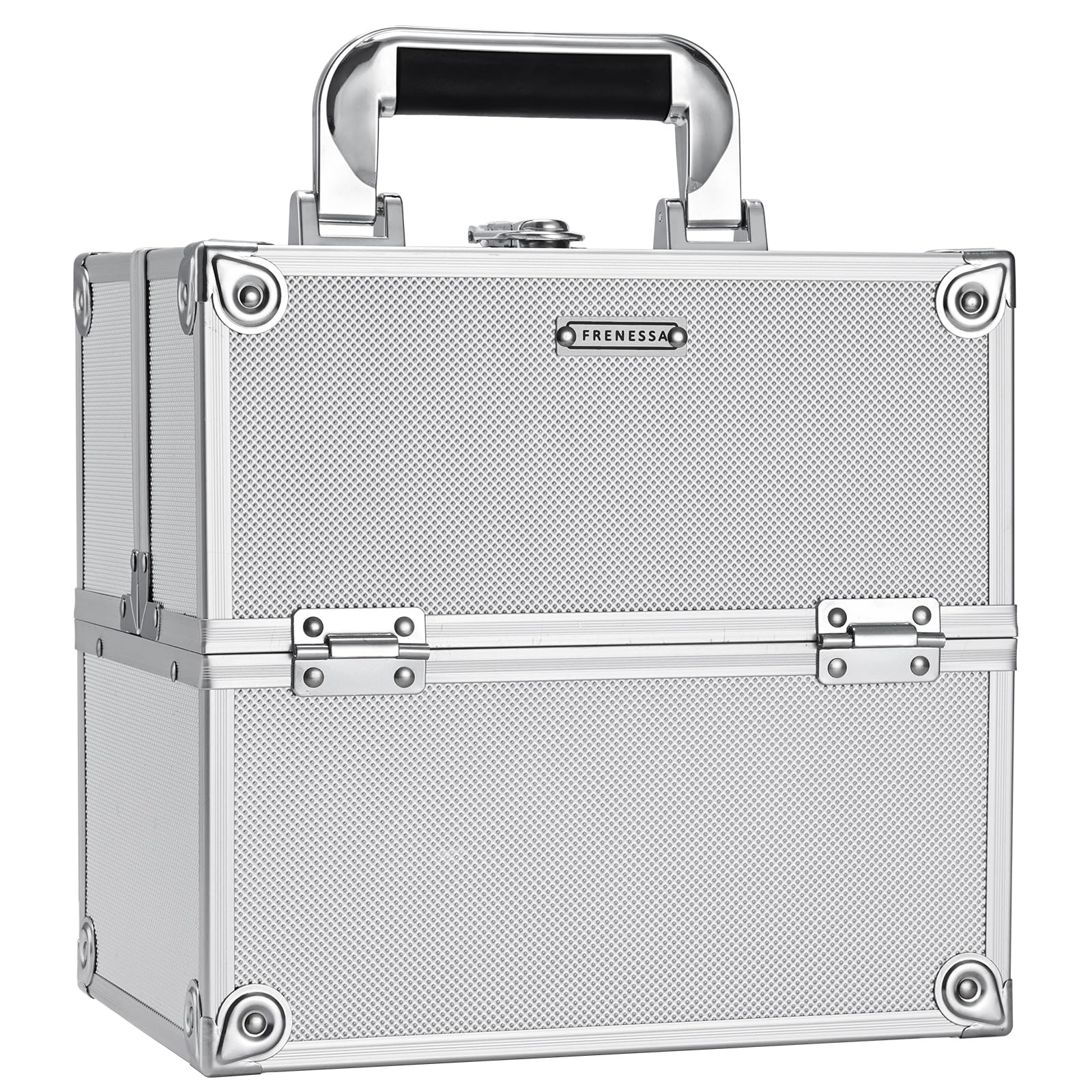 FRENESSA Makeup Train Case Makeup Organizer Box Portable Cosmetic Travel Case with Lock 4 Trays Aluminum Hard Vanity Box Make Up Artist Nail Beauty Storage Organizer Cosmetic Suitcase Bright Silver