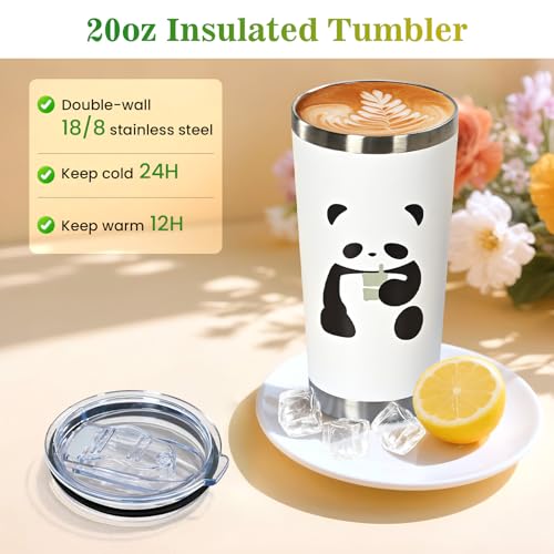 - ¡¼Insulated Vacuum Tumbler¡½: Made of 18/8 food-grade sturdy stainless steel, with double-walled vacuum insulation, this sweat-free 20oz insulated tumbler with lid can preserve beverage temperature up to 24h for cold & 12h for hot, great for iced coffee, tea, wine, juice, champagne, smoothies, sodas, milkshake, etc; this tumbler mug is irresistibly charming with its playful panda illustrations design