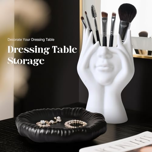 - UNIQUE BRUSH HOLDER & MODERN MUG: The face shaped makeup brush holder is not only highly functional but also a statement piece for any vanity or desk. Its wide opening keeps makeup brushes, pens, or other accessories neatly organized and easily accessible. Paired with a geometric ceramic mug, this set brings contemporary elegance to her coffee or tea ritual. Together, they create a harmonious blend of style and practicality, great for women who appreciate both beauty and utility