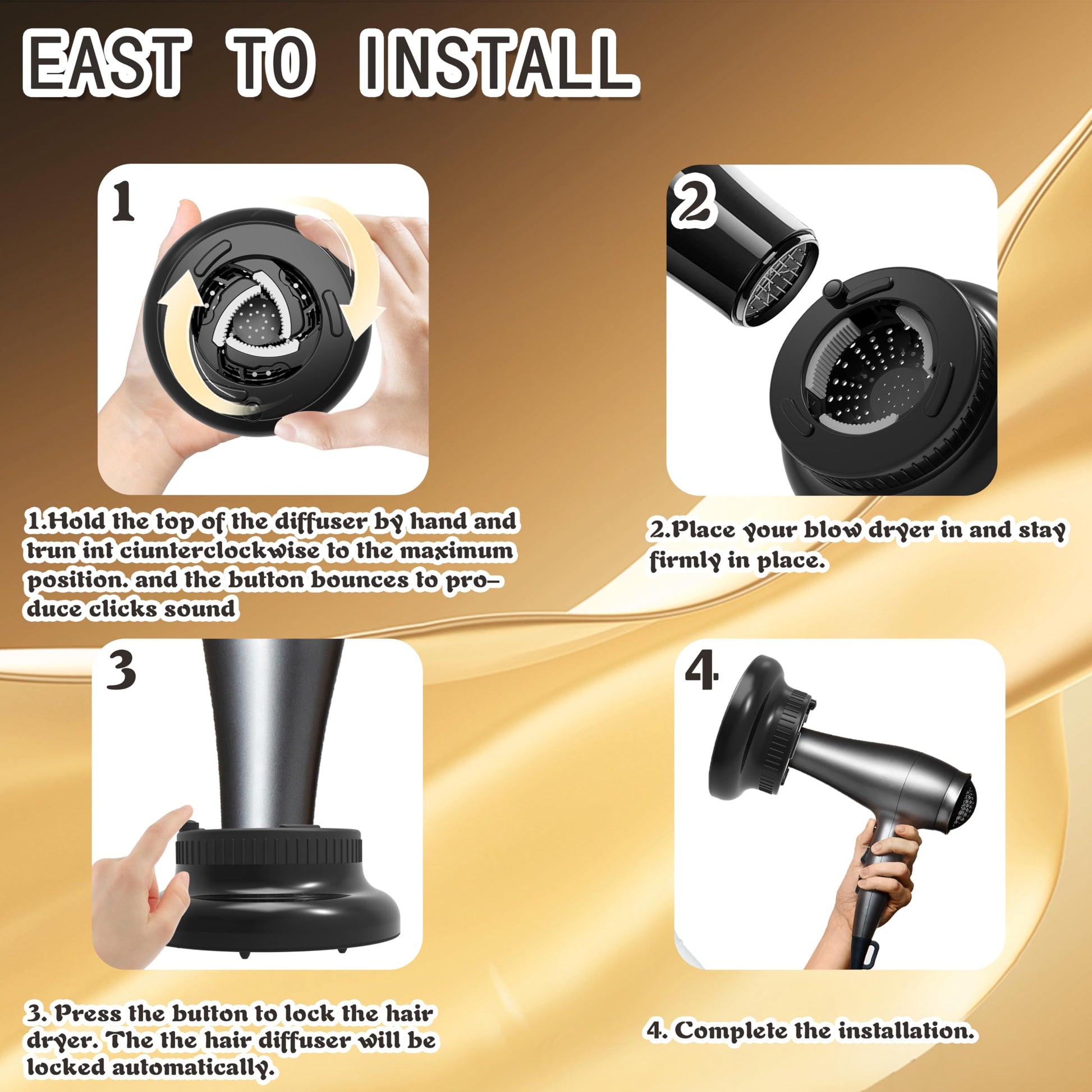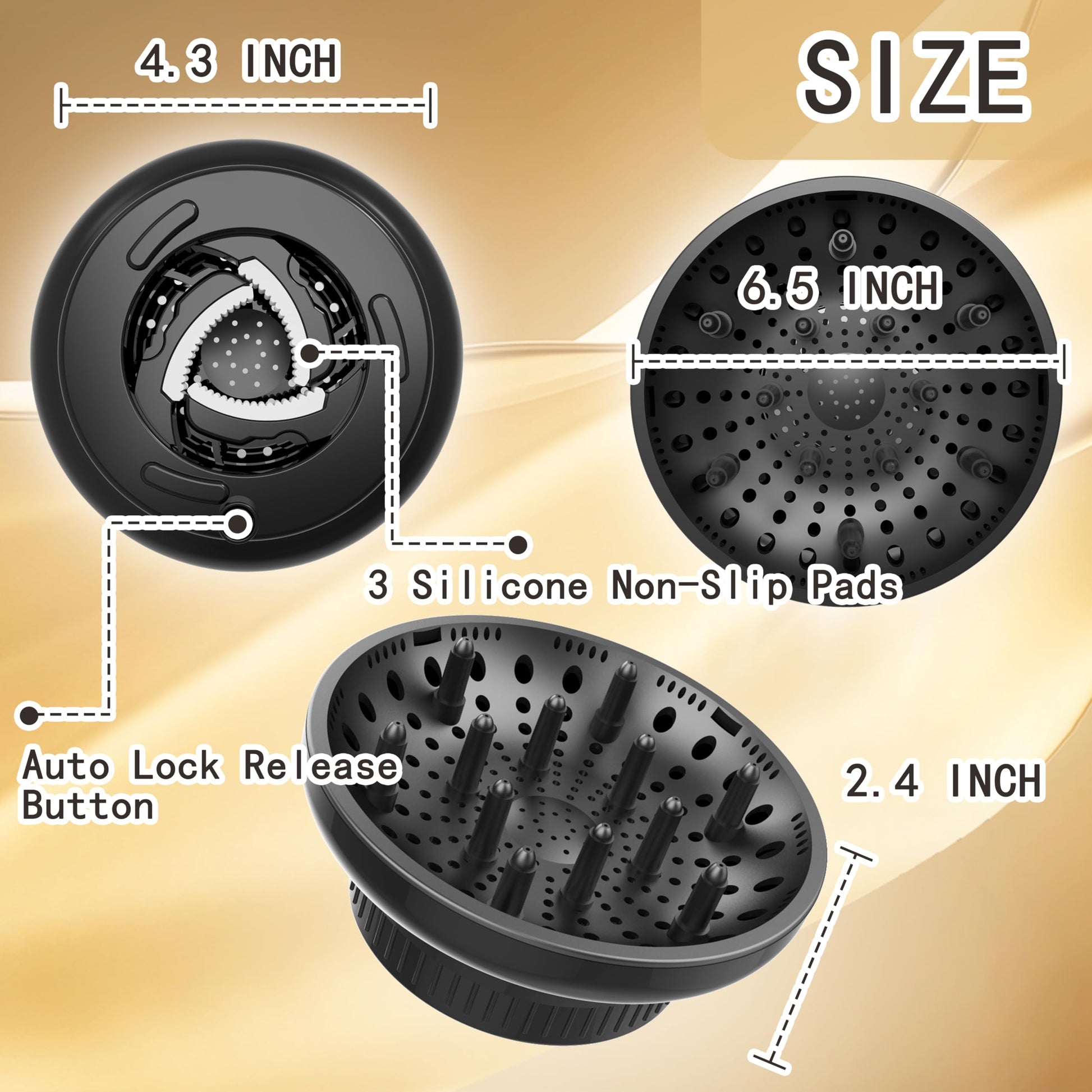 - — Hair Dryer Compatibility— This Universal diffuser use a new rotary design with lock button, can be adjusted and fits for hair、Attachment for Hair Dryer Hair Suitable for 1.4 inch to 2.4 inch,Add on the blow dryer diffuser attachment with a twist and a push. The silicone grip keeps the hair dryer attachment secure. MAKE SURE TO MEASURE YOUR HAIR DRYER NOZZLE SIZE BEFORE CHOOSE.