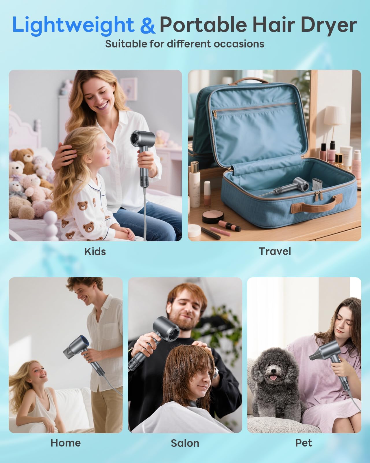 - Lightweight and Portable Ionic Hair Dryer for Home, Travel, Salon:Weighing just 0.89 lbs (400g)—lighter than a cup of coffee—this travel hair dryer for women is designed for effortless portability and comfort. Its compact size makes it perfect for slipping into your luggage or gym bag, ensuring you can enjoy convenient styling on the go. The ergonomic handle reduces fatigue during extended use, while the 360° rotating magnetic nozzle provides versatile styling options for all hair lengths and types