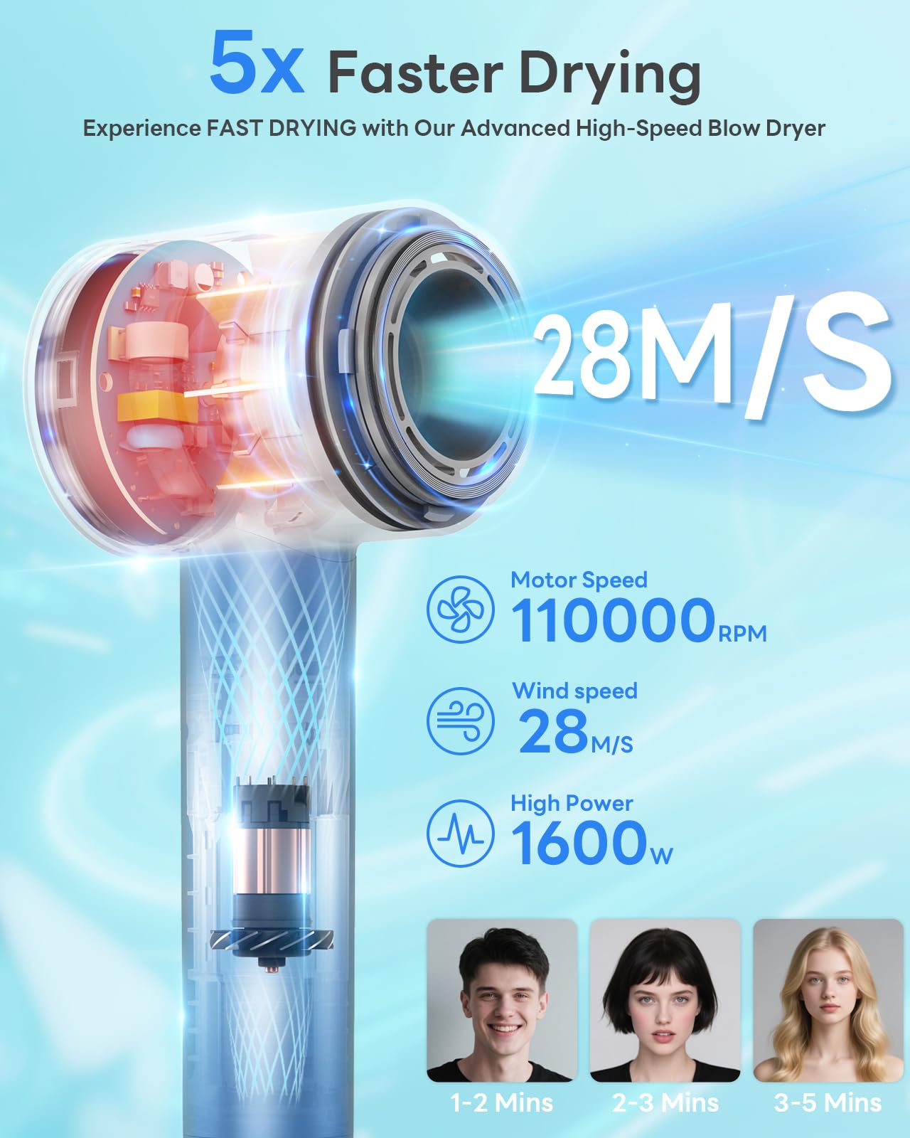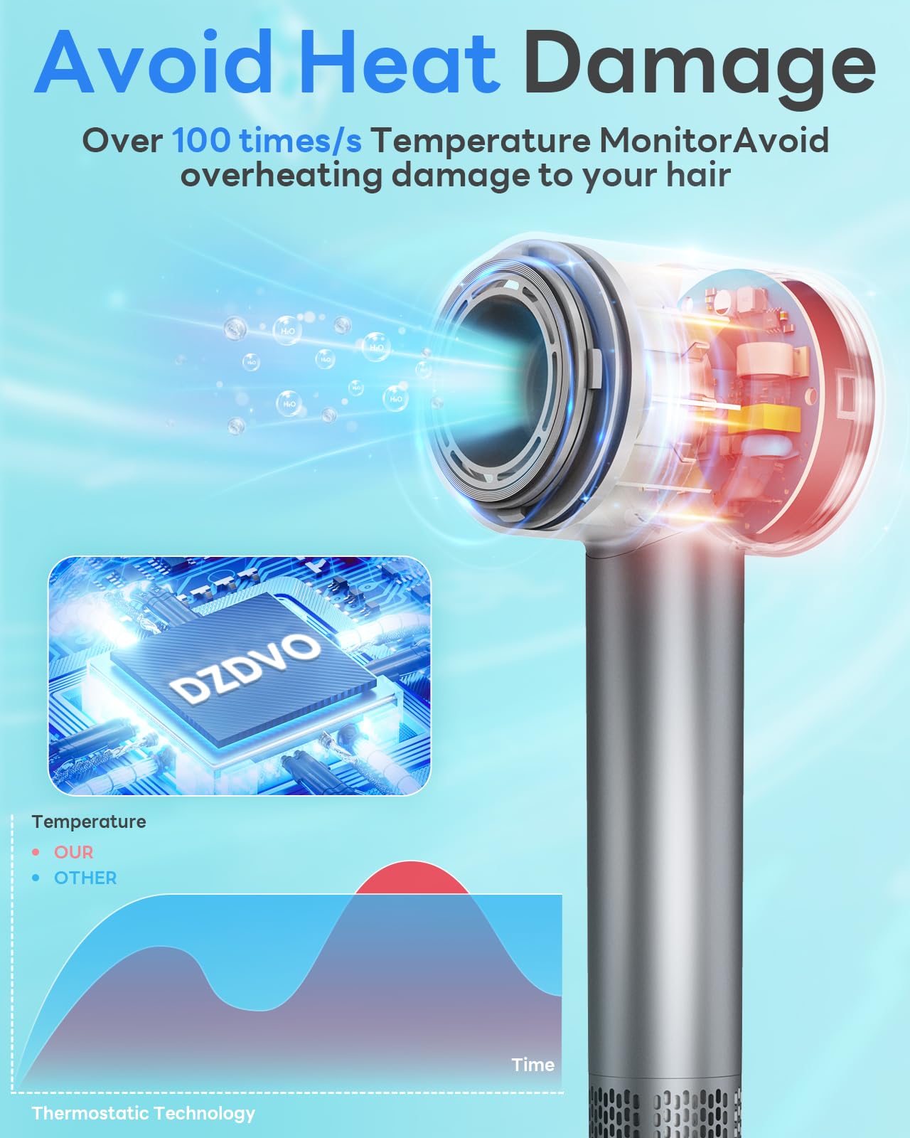- Ultra-Fast Drying Blow Dryer with Powerful Motor:The DZDVO Ionic hair dryer for women features a genuine 110,000 RPM high-speed brushless motor, delivering powerful airflow of up to 28 m/s. This advanced motor dries your hair in just 3 to 8 minutes—5 times faster than traditional blow dryers. Whether you're rushing in the morning or winding down after a long day, you can enjoy salon-quality hair care results in no time. For optimal performance, we recommend cleaning the removable dust cover every two months