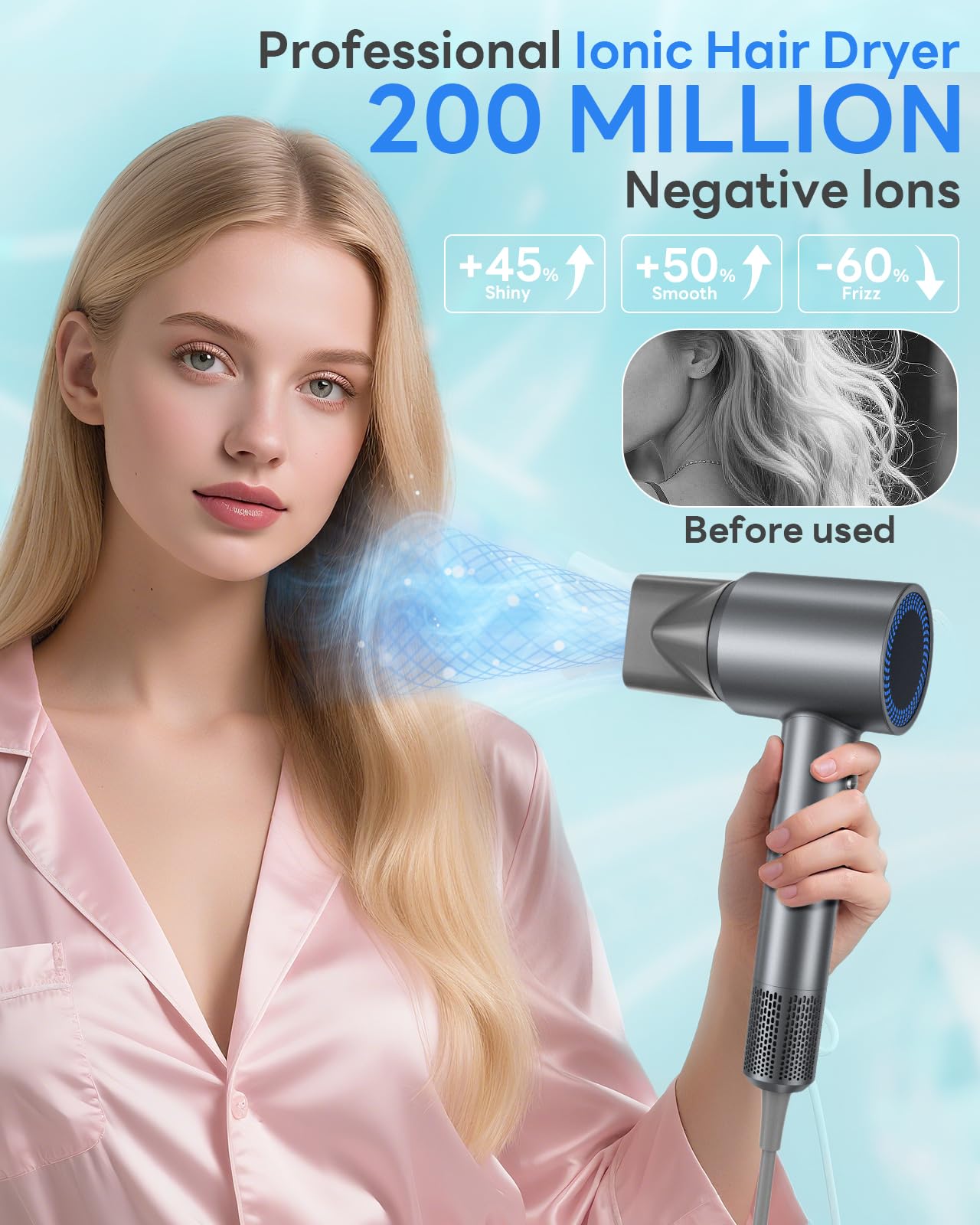 - Advanced Plasma Technology:Our Plasma hair dryer integrates advanced Plasma technology, releasing up to 200 million plasma ions to fight frizz and static. This powerful combination works to lock in moisture, ensuring your hair stays soft, shiny, and healthy. Suitable for all hair types, including curly, wavy, and color-treated hair, this hair blow dryer is ideal for achieving beautiful results at home