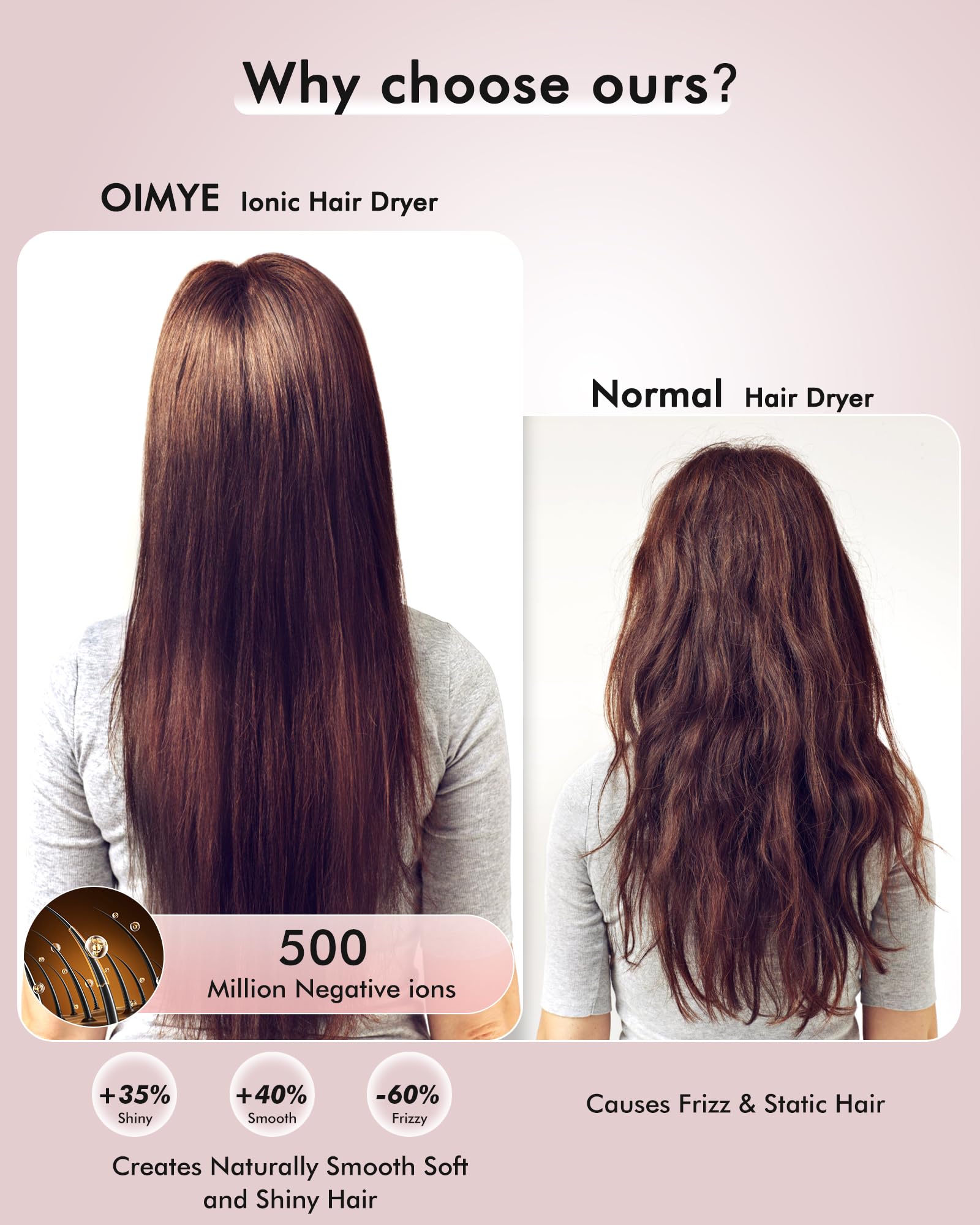- 🌟【Negative Ionic Technology for Softer & Smoother Hair】 -- Experience the magic of ionic hair care. High-velocity airflow incorporates up to 500 million negative ions to help seal and flatten the hair cuticle, locking up to 90% moisture of your hair, deeply nourishing your hair, protect your scalp, makes hair hydrated and glossier. Our ionic hair dryer also eliminates static electricity on the hair surface so hair is less likely to tangle, frizz-free, silk smooth, and looks healthier