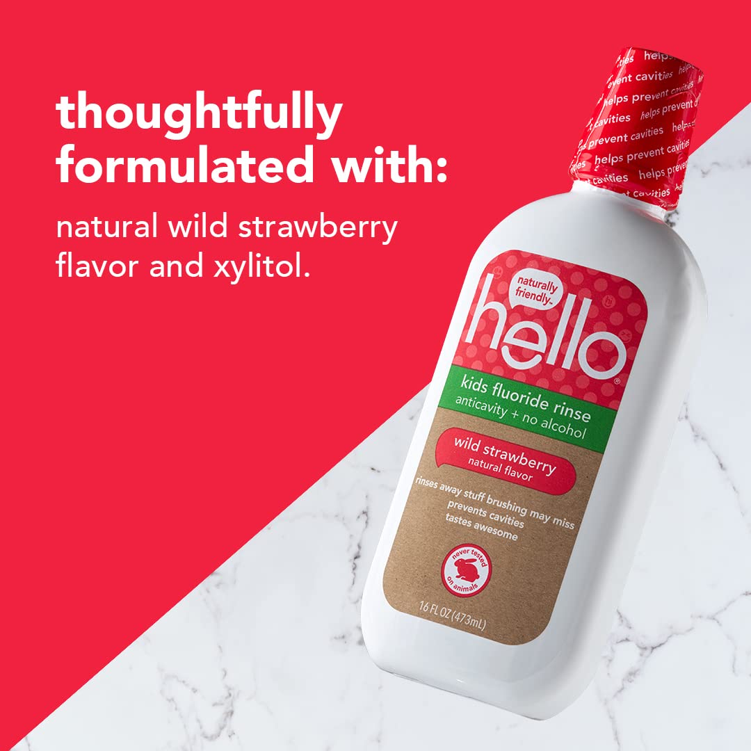 Details: Say hello to naturally friendly™ kids anticavity and alcohol free rinse in natural wild strawberry flavor. This kids wild strawberry fluoride rinse prevents cavities and strengthen enamel. It also rinses away stuff brushing may miss and is thoughtfully formulated with natural sweeteners and flavors like wild strawberry and xylitol. Best of all, our natural wild strawberry flavored rinse is formulated without mint so kids can say goodbye to "spicy", and hello to natural flavors that'll make them smile wide. Hello contains no alcohol, no artificial sweeteners, no artificial flavors, no dyes, no preservatives, no microbeads, no parabens, no sls/sulfates, and no gluten. Hello is also vegan, never tested on animals (Leaping Bunny Certified and PETA recognized) and made in the USA. Finally, a kids anticavity and alcohol free rinse that tastes so delicious they’ll rush to rinse. Hooray. Directions: Adults and children over 6: use once a day after brushing your teeth with a toothpaste. Vigorously swish 10mL (2 teaspoons) of rinse for 1 minute and then spit out. Do not swallow rinse. do not eat or drink for 30 minutes after rinsing. Children under 6: consult a dentist or doctor.
