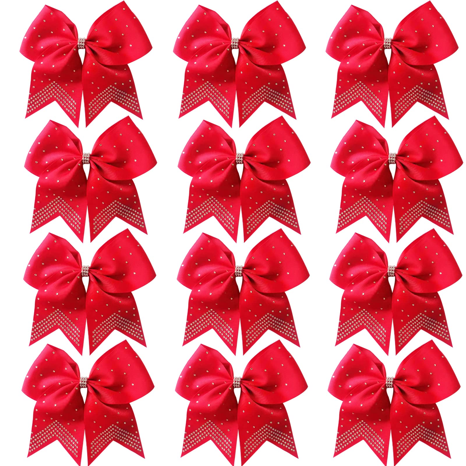 Hipcheer 12PCS 8" Rhinestones Large Cheer Hair Bows for Girls, Hand-made Grosgrain Ribbon Hair Accessories for Teen Girls Softball Cheerleader Sport (Red)