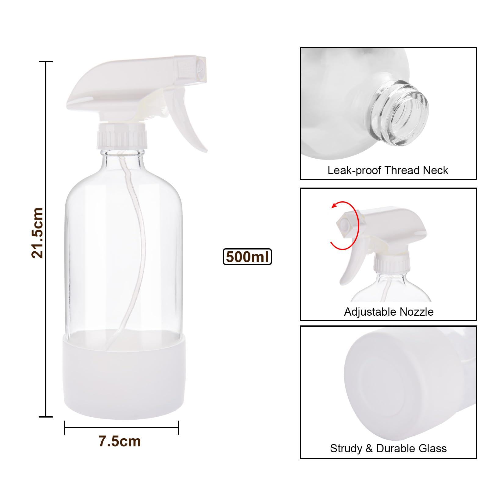 - ADJUSTABLE SPRAY NOZZLE: This premium glass spray bottle features a leak-proof nozzle with 3 modes: mist spray for delicate coverage, stream spray for targeted application, and Off lock. Perfect as cleaning spray bottle, plant spray bottle or hair spray bottle across gardening, beauty, and home uses.