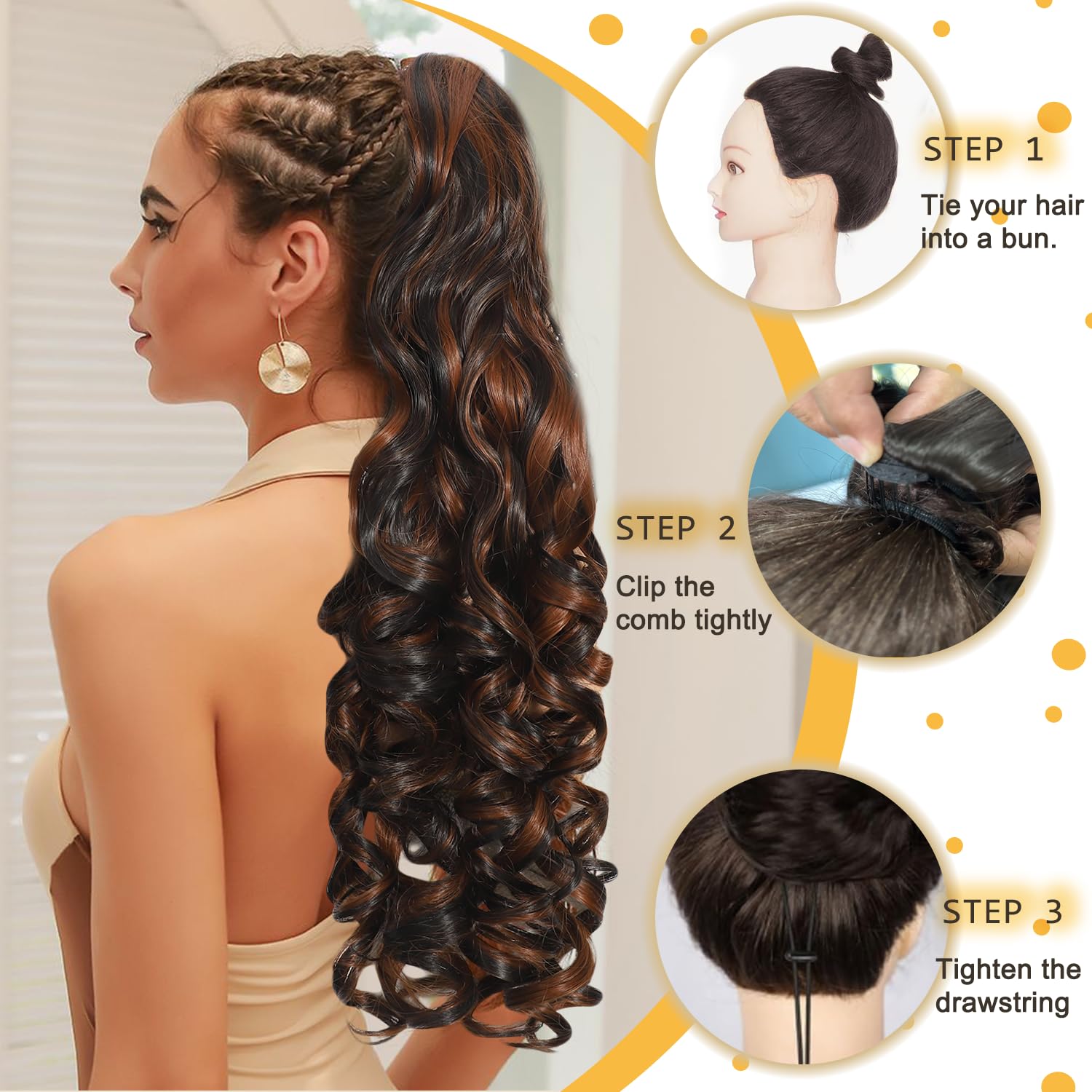 - 【Easy to Use and Care】curly Ponytail Extension Simply tie your hair into a small bun, open the drawstring, place the ponytail extension on top, clip it into place, and tighten the drawstring to secure it. In just one easy step, you can add instant volume and length to your hair, effortlessly transforming your hairstyle. To prevent tangling, shake the ponytail extension after opening the package, use a spray bottle with a care solution to gently spritz the ponytail extension.