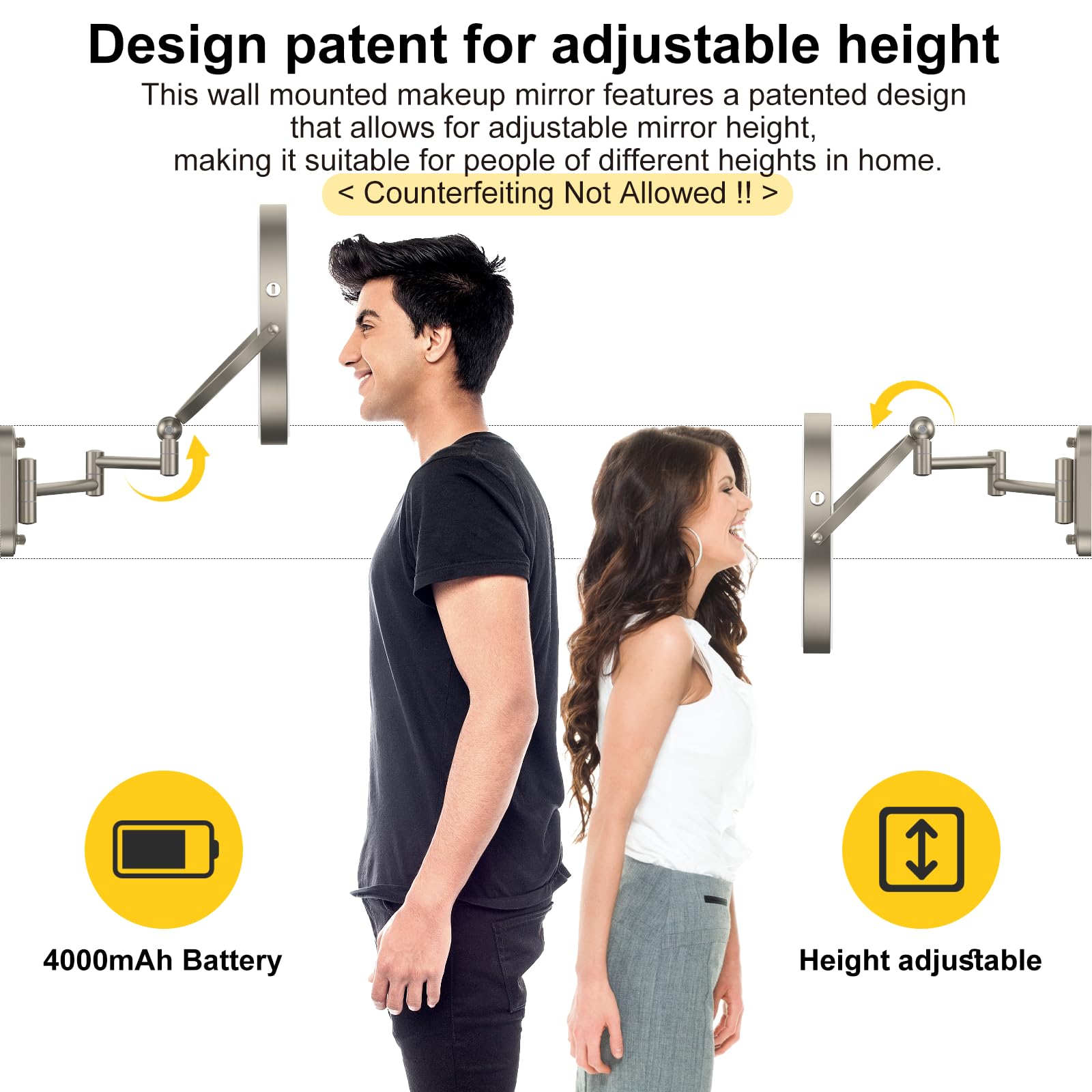 - Premium Material&Easy Installation: This wall mounted lighted makeup mirror's frame, column, and base are crafted from expensive pearl nickel and feature a multi-layer electroplating and polishing process, providing durability, moisture resistance, and rust resistance. This makeup mirror with lights and magnification is very simple to install, Please check that all accessories are complete before installation, the base can be installed to any wall with simple screws (The bathroom mirror with lights may not be fully charged when leaving the factory, please fully charge it before the first use after installation).