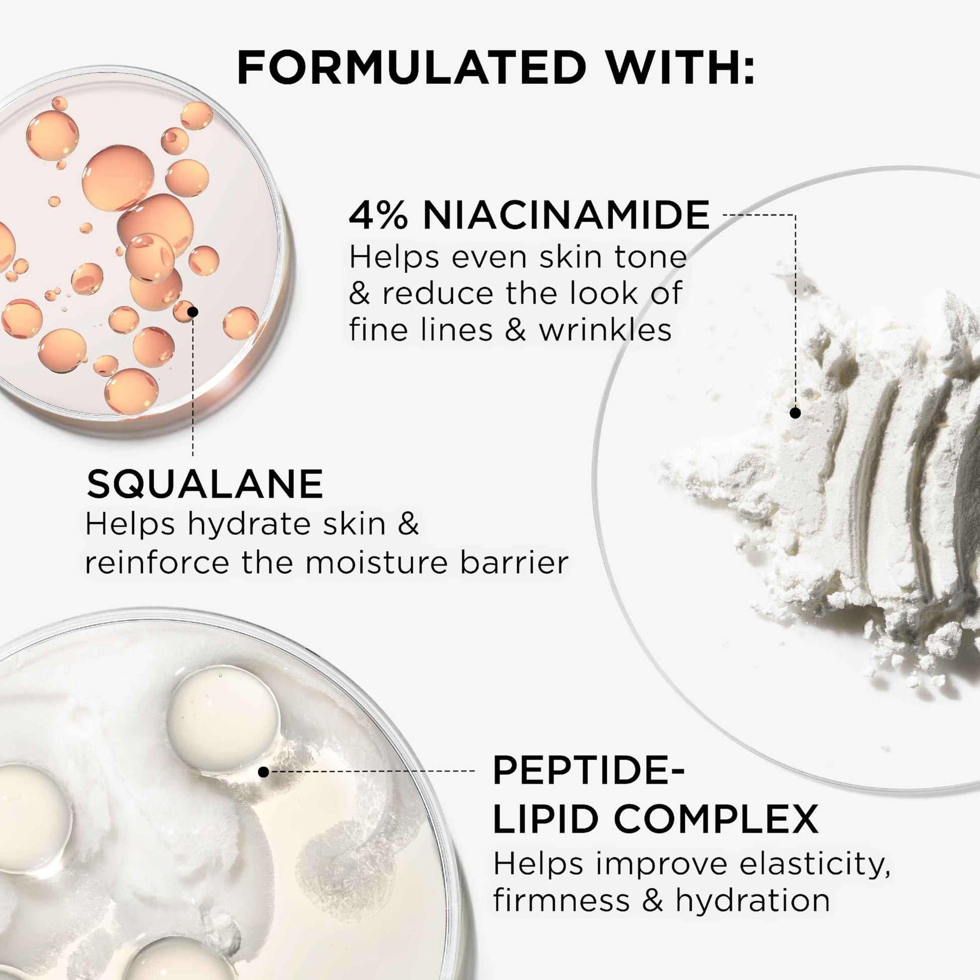 - INGREDIENTS - Formulated with niacinamide to even skin tone and reduce fine lines/wrinkles; peptide-lipid complex to boost elasticity and firmness; squalane to hydrate and strengthen the moisture barrier for healthier skin