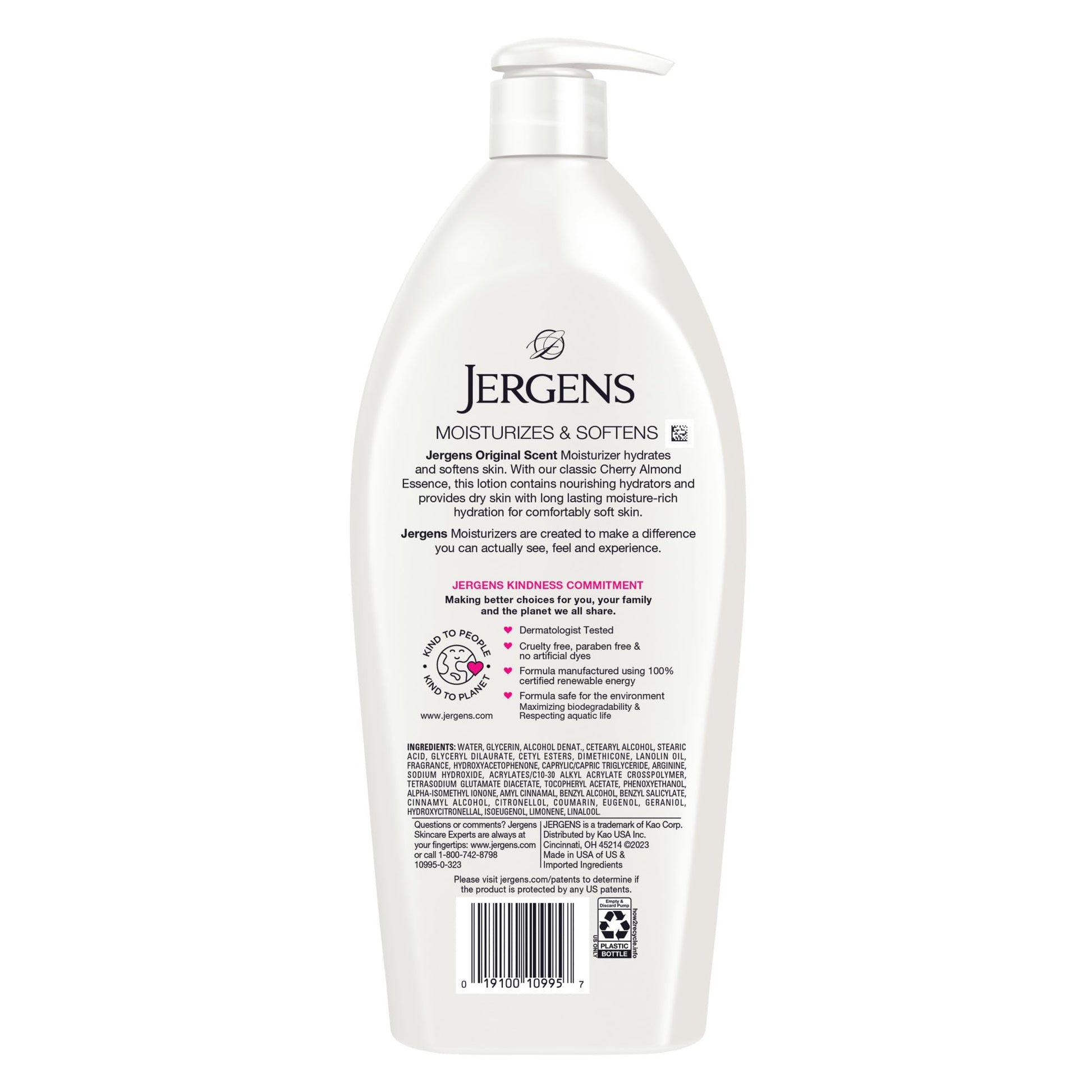 Details: Reveal softer, more radiant skin when you smooth on Jergens Original Scent Dry Skin Body Moisturizer with Cherry Almond Essence. It provides long-lasting, moisture-rich hydration and noticeably softer, smoother skin. Our formula, with a unique HYDRALUCENCE blend, nourishing hydrators, and Jergens Cherry Almond essence, leaves skin deeply luminous and lightly scented. Jergens hand and body lotion for women and men is carefully formulated for optimal dry skin relief. Jergens hand lotion with pump hydrates and moisturizes dry and cracked hands for extra dry skin relief. Body cream for women and men soothes skin for long lasting hydration. Hand cream for dry cracked hands rejuvenates cracked skin for optimal moisture. Satisfaction Guaranteed. Limitations may apply.