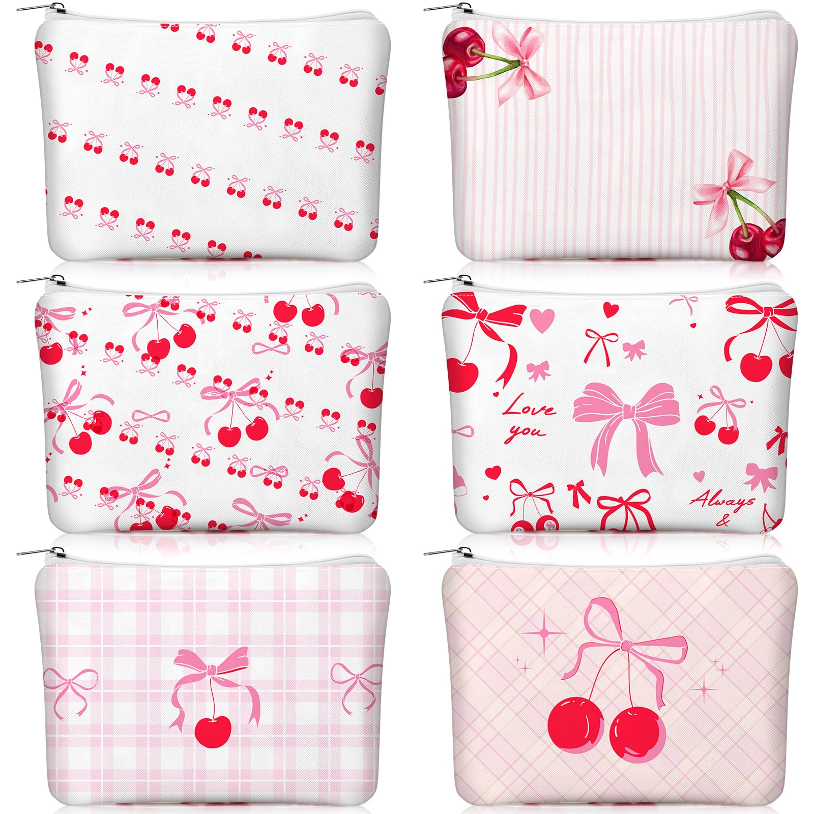 - Quality Set: the set contains six cherry bow pink makeup bags, each with a different cute pink style, you can enjoy different cherry bow patterns at the same time, and each makeup bag is made of canvas; You can use them individually for different purposes, or share them with friends - either way, you can easily cope with any occasion