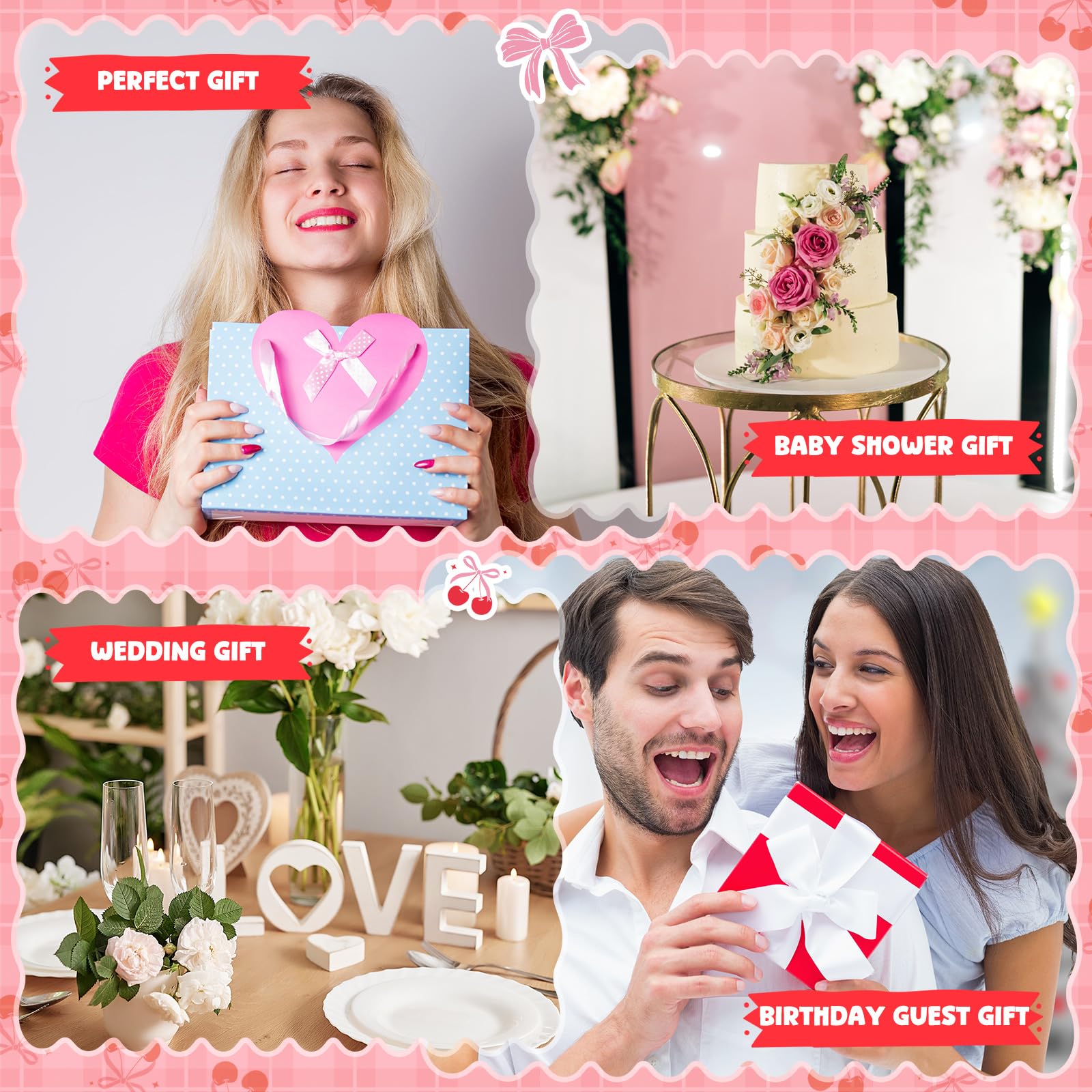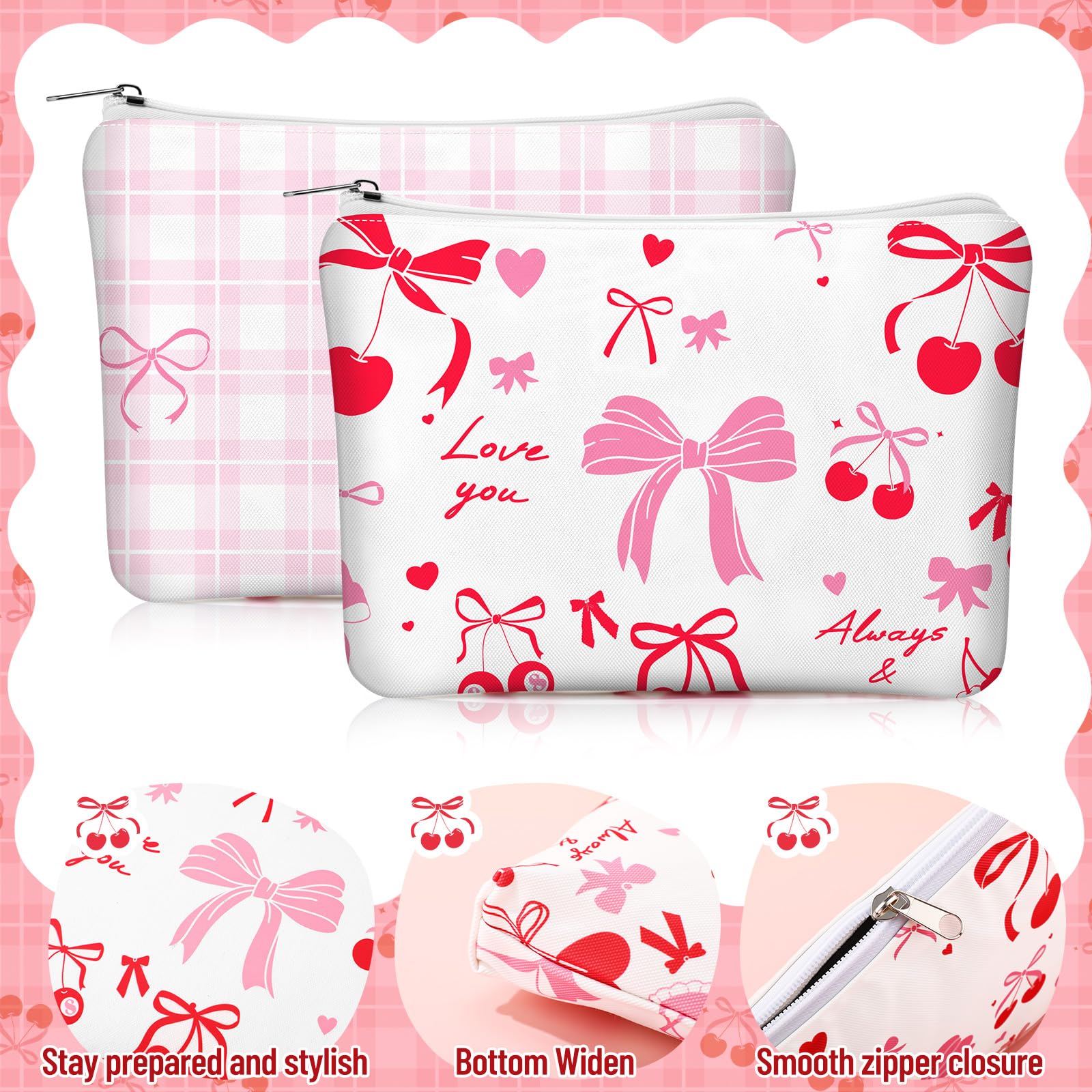 - Suitable Gifts: these bags are suitable gifts for friends and family, or even for yourself! Cherry bow makeup bags can be applied for Valentine's Day, graduation season, birthday parties, Thanksgiving, Mother's Day or Christmas, and their cute design and practical size ensure that they are both thoughtful and practical