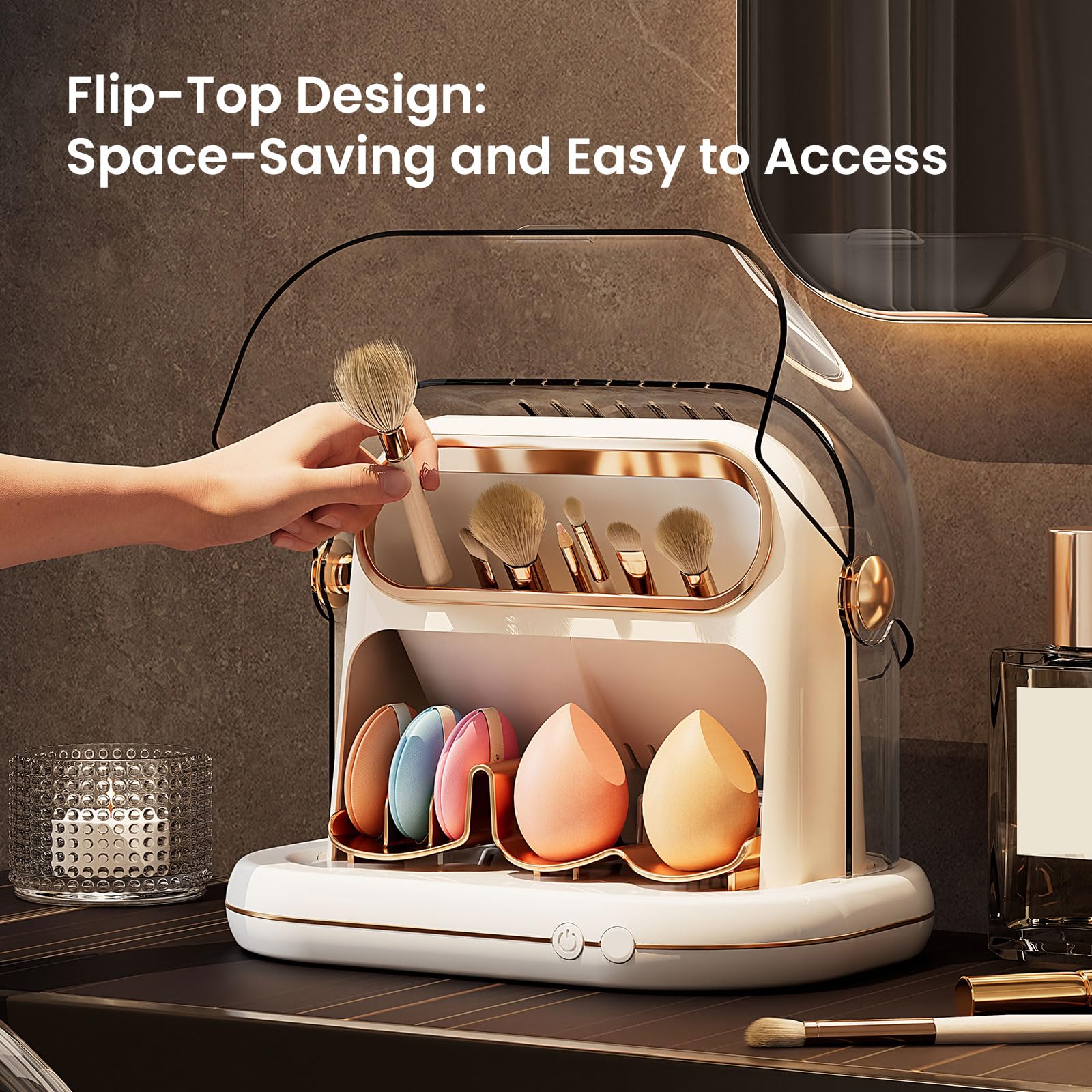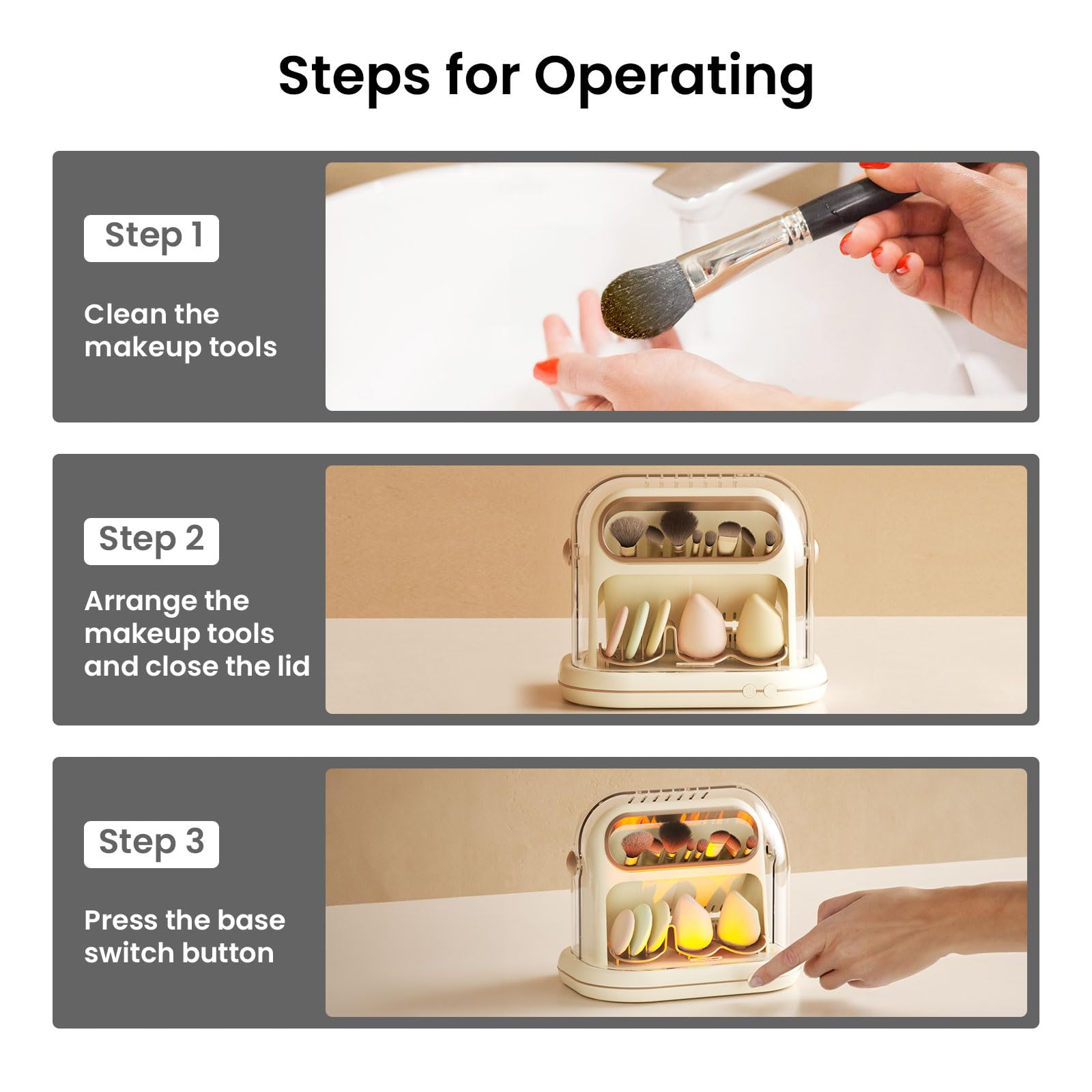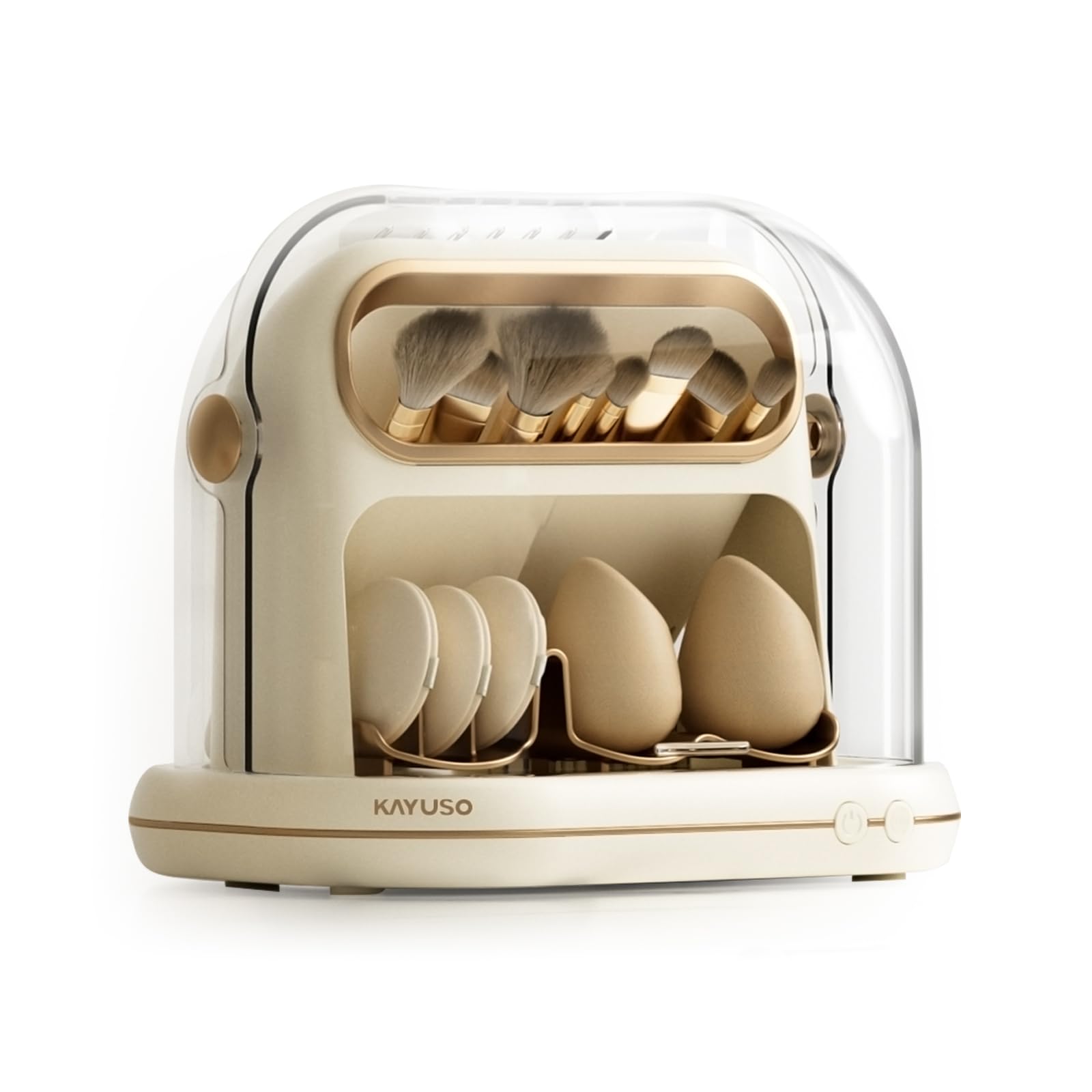 - The 360° Circulating Dry system: Features smart zoning for optimal care. The upper low-temp zone preserves brush shape while keeping bristles fluffy and soft, preventing bristle damage for long-lasting premium quality, while the lower medium-temp zone uses direct airflow for efficient drying that maintains elasticity and shape in beauty blenders and sponges—no deformation, just lasting bounce